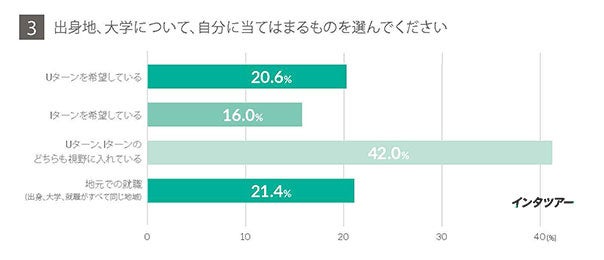 回答が最も多かったのは、「Uターン、Iターンのどちらも視野に入れている」42.0%、「Uターンを希望している」20.6%といった結果で、「Iターンを希望している」16.0%を上回りました。また、出身地域の大学に進学し、出身地域の企業に就職する「地元就職」を希望している学生は21.4%となりました。