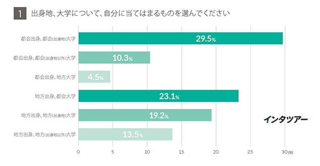 今回の回答者は、都会出身で出身地の大学に在学している学生が29.5%と最多であり、次いで地方出身で都会の大学に在学している学生が23.1%と続きました。都会出身者は全体の44.2%、地方出身者は55.8%となり、地方出身者の割合が高くなっています。また、都会の大学に通う学生が62.9%、地方の大学に在学している学生が37.1%となっています。