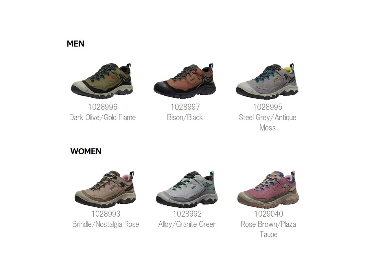 ミッドカットモデル『TARGHEE IV MID WP(ターギー フォー ミッド ウォータープルーフ)』はメンズ4色、ウィメンズ3色展開。ローカットモデル『TARGHEE IV WP(ターギー フォー ウォータープルーフ)』は、メンズ・ウィメンズ共に各3色展開です。