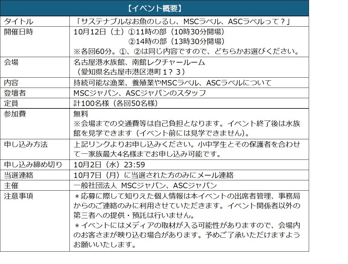 水産資源や環境に配慮した持続可能な漁業、養殖の普及に努める非営利団体MSC(海洋管理協議会)ジャパンおよびASC(水産養殖管理協議会)ジャパンは、10月12日(土)、小中学生を対象に「サステナブル・シーフード」に関する教育イベントを名古屋港水族館で実施します。