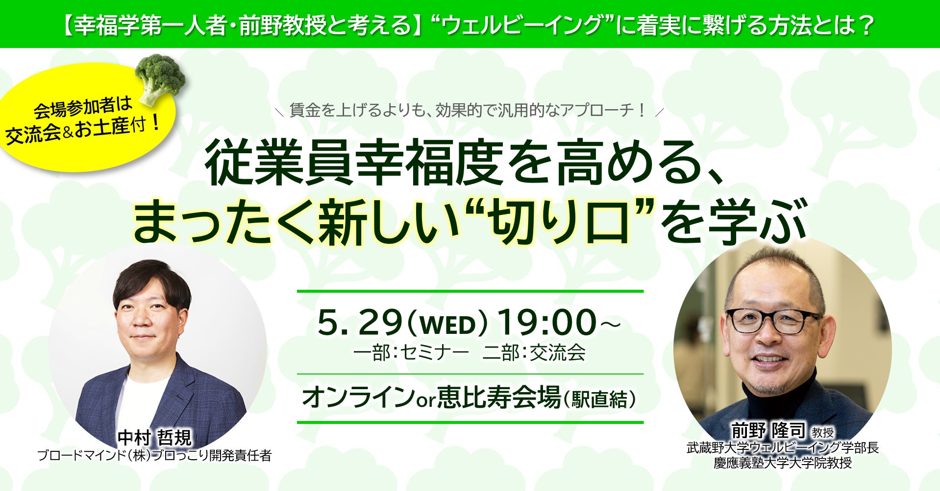 「金融に倫理を、人生に自由を」をミッションとし、人々のライフプラン実現をサポートするサービスを開発提供するブロードマインド株式会社(本社:東京都渋谷区、代表取締役社長:伊藤清、証券コード:7343)は、5月29日(水)19:00より、幸福学研究の第一人者であり、この春より武蔵野大学にて日本初創設のウェルビーイング学部学部長に就任した前野隆司教授をお招きし、【従業員幸福度を高める、まったく新しい“切り口”を学ぶ】セミナーを開催いたします。