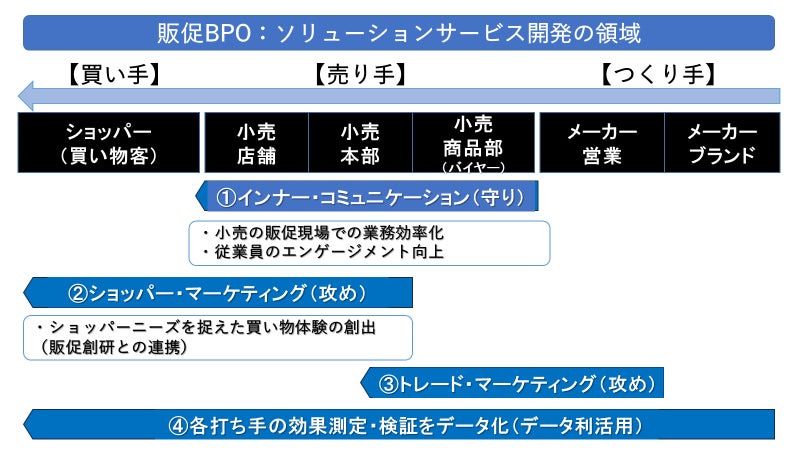 販促BPOは、販促現場における多種多様な課題を解決するための施策を企画提案し、実施パートをワンストップで請け負うことで、販促現場の効率化と成果、その検証まで一気通貫でその価値を提供する運用・伴走型サービスです。