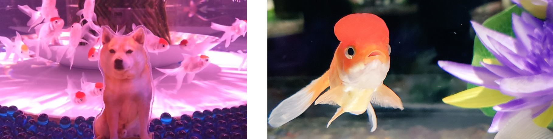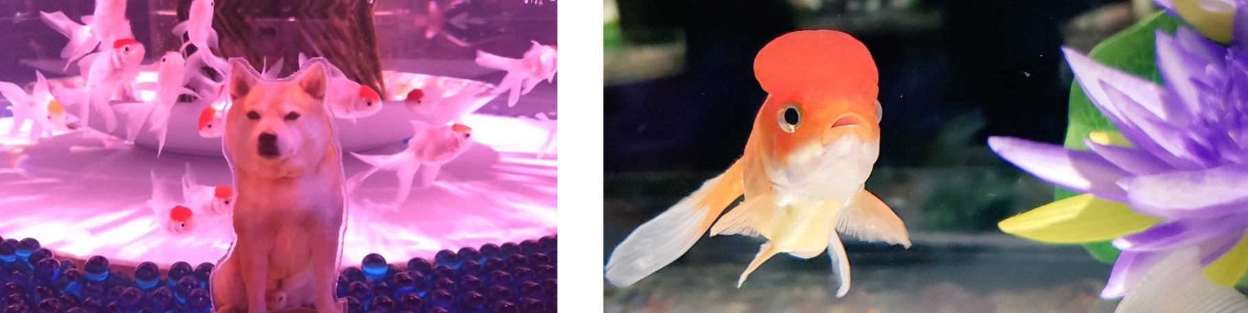 金魚と豆柴の表情がなんとなーく似ている気がしてきちゃうユニークな一枚。