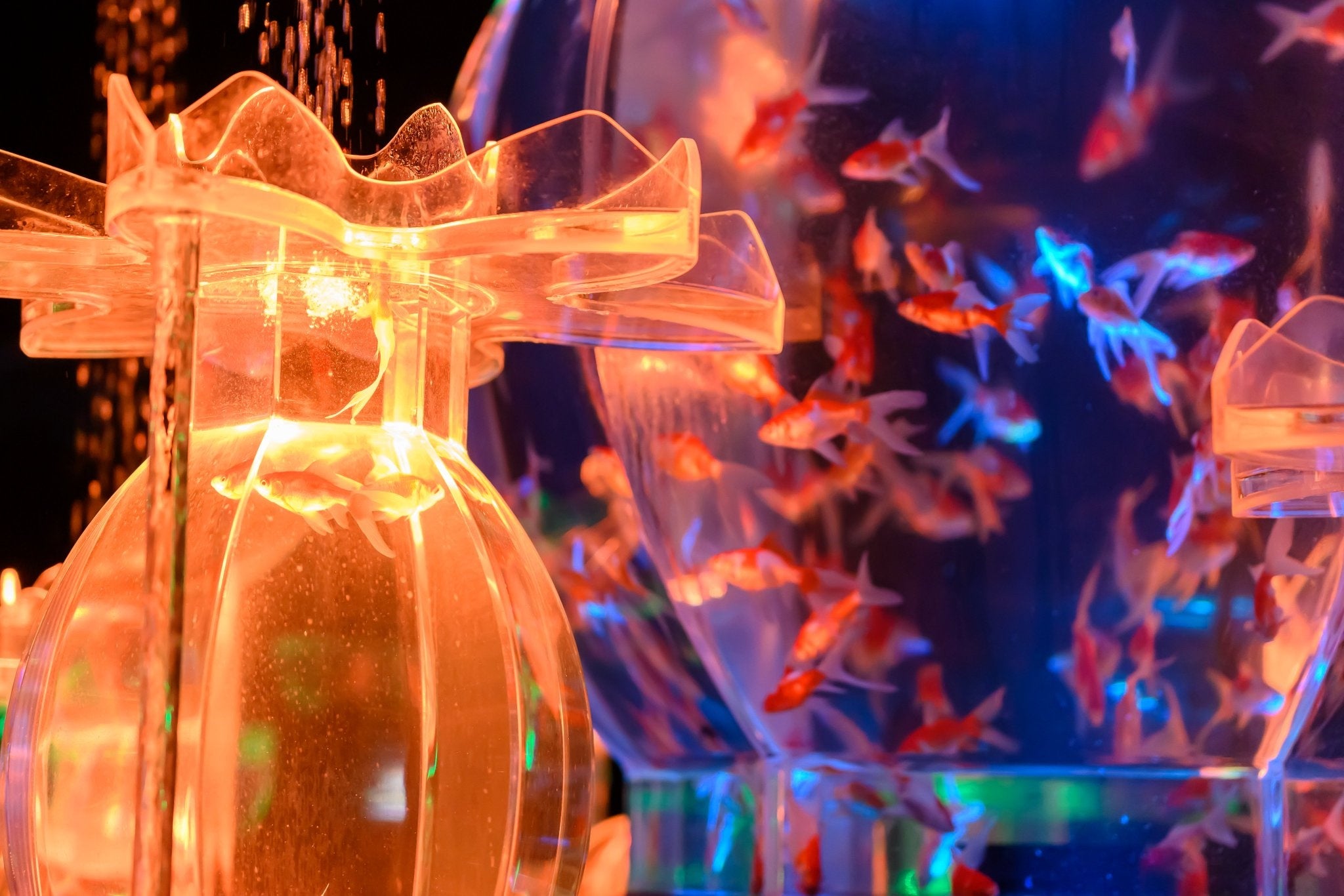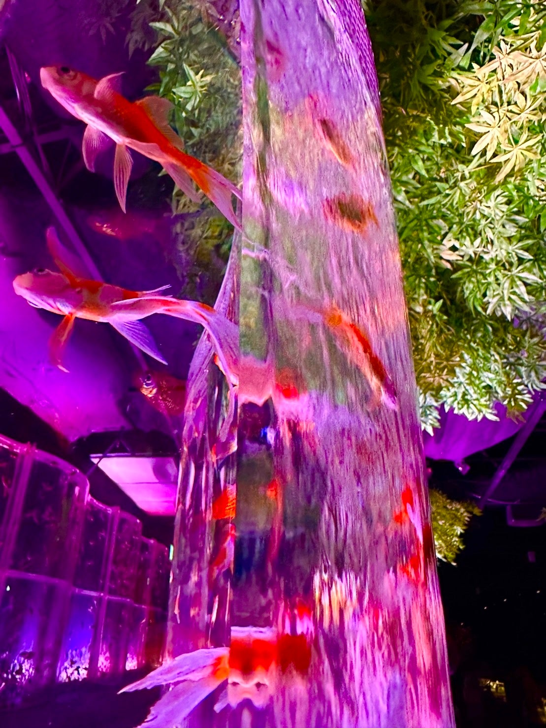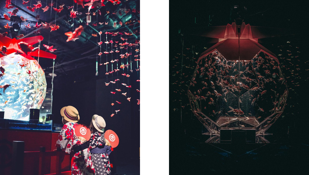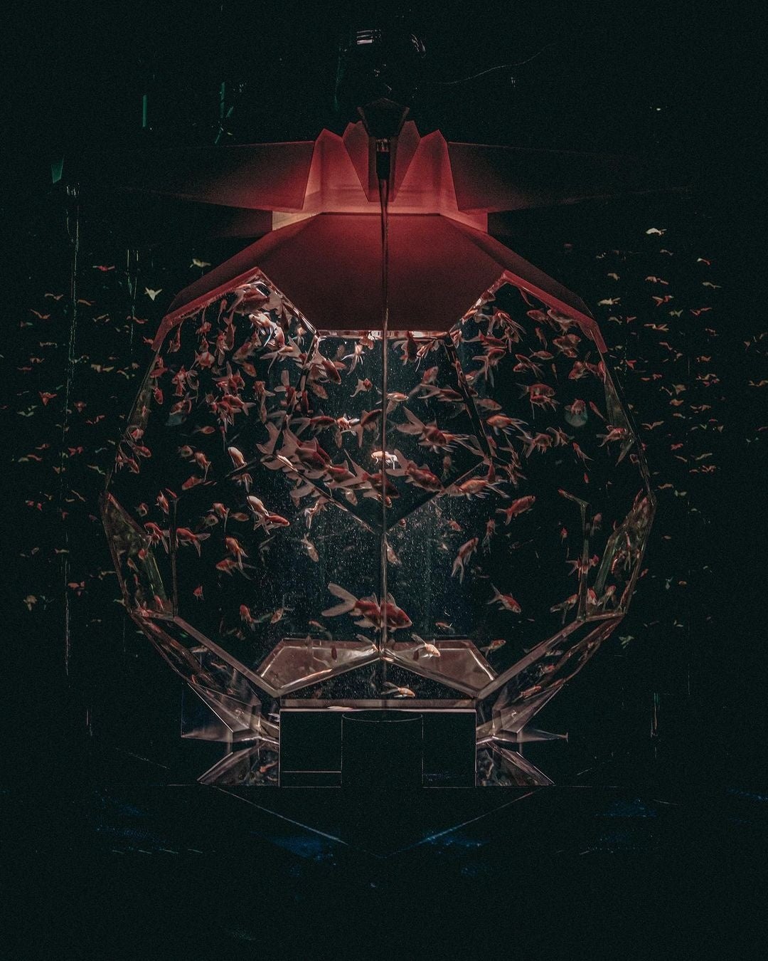 夏に公開した新作水槽作品「天空リウム」を幻想的に撮影していただいた一枚。流れる水しぶきと水槽のなかを優雅に泳ぐ金魚が涼やかな作品です。
