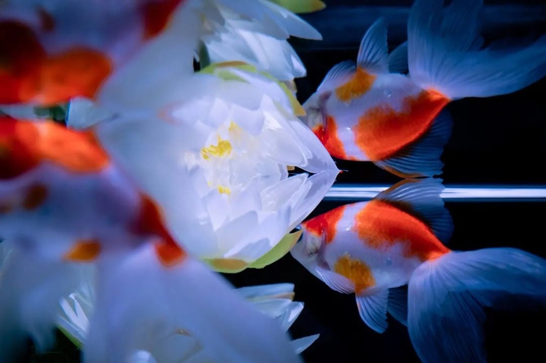 反射した夏の花・蓮と金魚がまるでアート作品のような一枚。