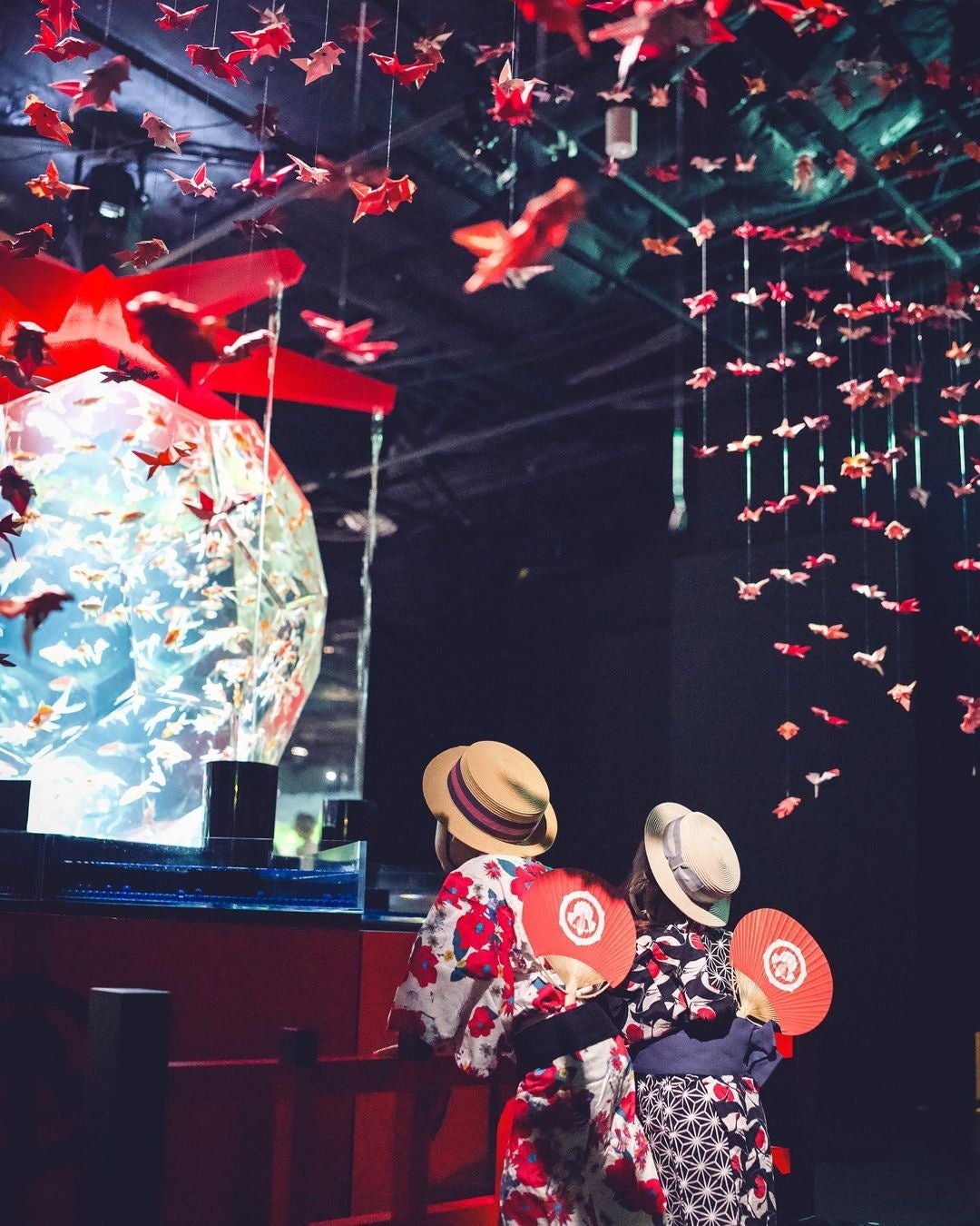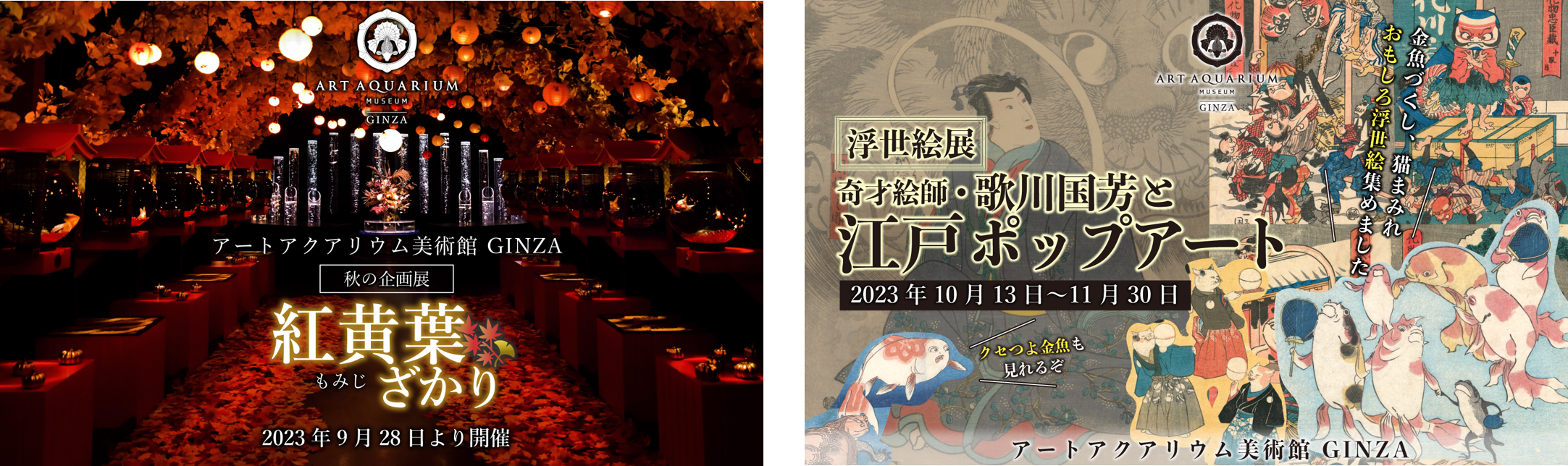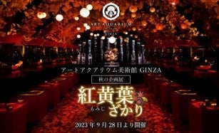 アートアクアリウム美術館 GINZAでは、紅葉やイチョウ、すすきなどが彩る秋景色のなかを金魚が優雅に泳ぎ、幻想的なのにどこかエモい、そんな空間が広がる秋の企画展が開催中です。