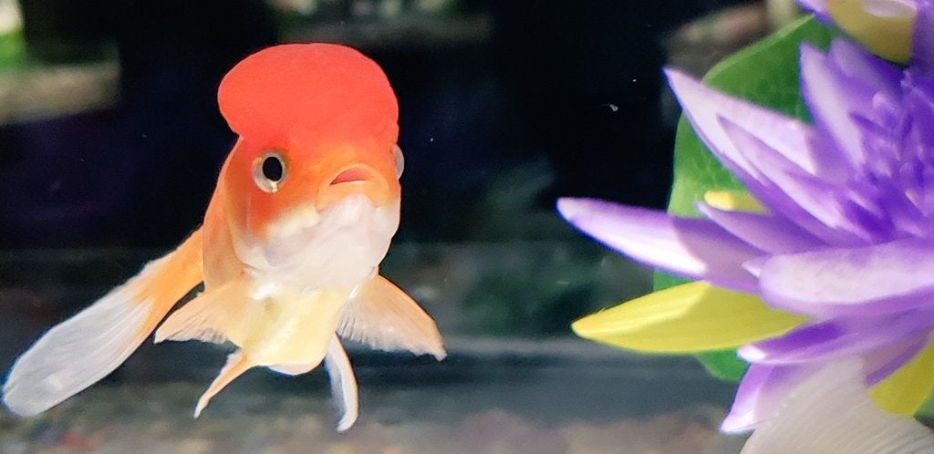 蓮の花が彩る水槽を泳ぐ金魚の、ぽわっとした表情が切り取られた一枚。