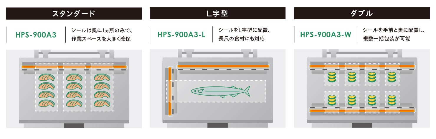 機械内のシール加工できる辺は、奥の辺のみのスタンダードに加え、L字型(奥の辺、左辺)、ダブル(奥と手前の辺)の3タイプから選択できます。