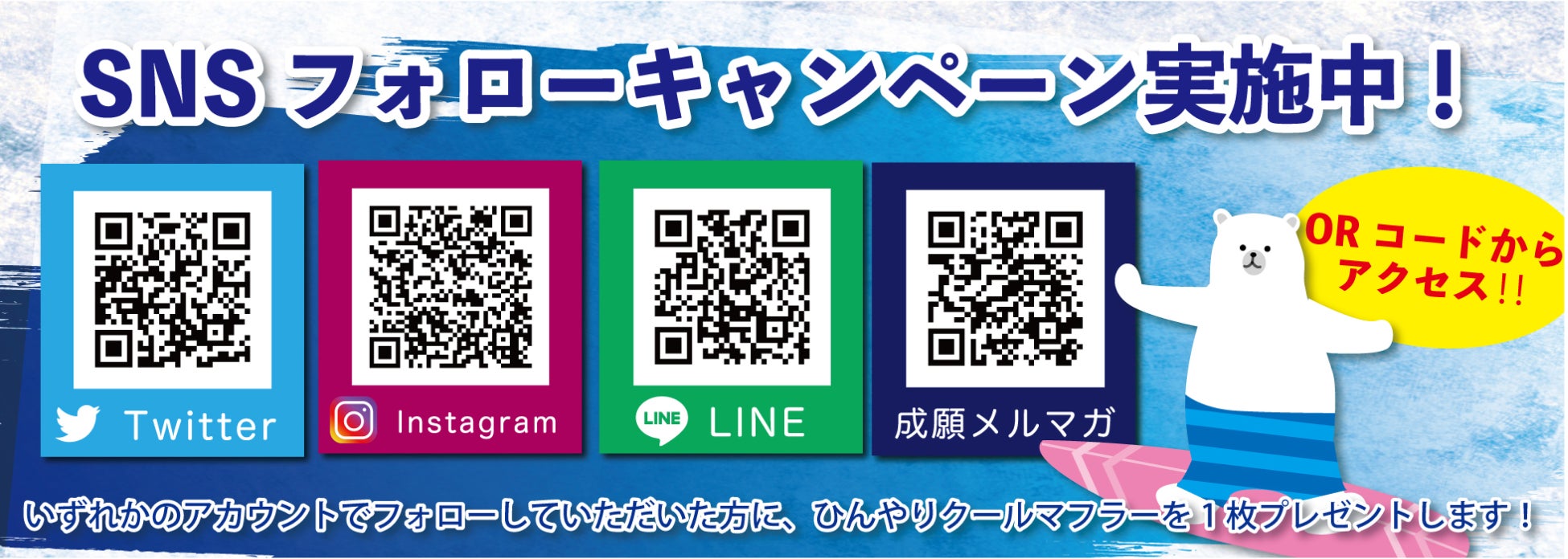 Twitter等の成願公式アカウントをフォローしていただくと、その場でクールタオルをプレゼントいたします!