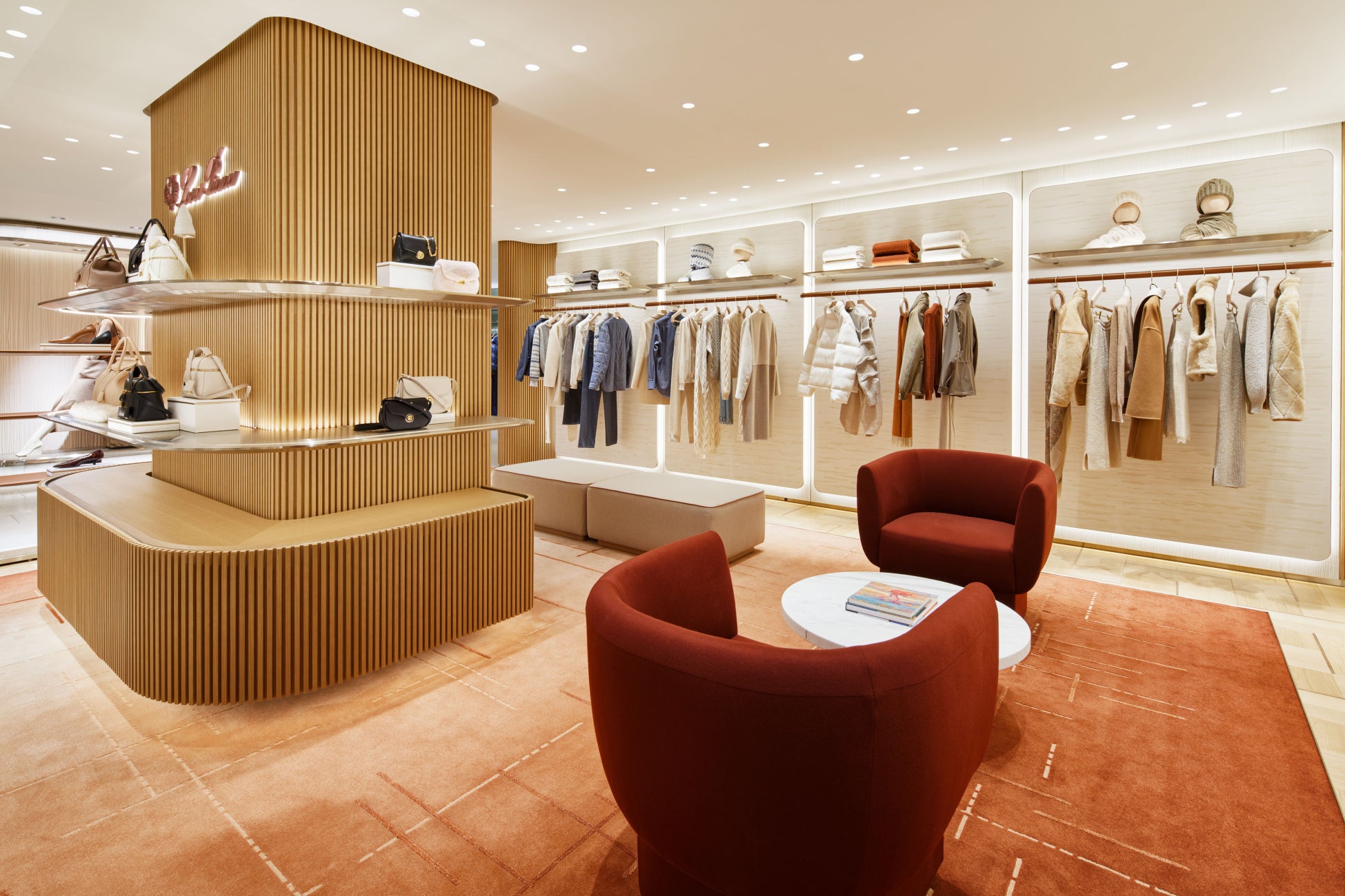 ミニマルで洗練されたダイナミックな店舗のコンセプトとインテリアデザインは、ロロ・ピアーナの真髄を表現しており、天然素材、温かみのあるカラーパレット、シグネチャーであるオーク材とカラボッティーノのディテールがコアとなっています。これはメゾンの伝統とセルジオ・ロロ・ピアーナのレガシーへのオマージュであり、クラシックでありながら現代的なタッチで再構築されました。空間全体は、洗練と快適さの完璧な融合であり、魅力的な「我が家のようなくつろぎ」感にあふれています。ロロ・ピアーナ・インテリアによる豊かな質感の仕上げ、シルクのカーペット、ラフィアやシルクの壁装は、メゾンの官能的なタッチへのこだわりを象徴しています。温かみのあるアースカラーのクンメルは、柔らかな照明と相まって、魅力的で包み込むような雰囲気をさらに高めています。