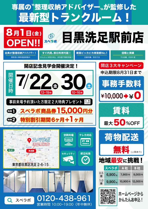 【8月1日(月)オープン】見学から契約、解約まで完全非接触・非対面、お申し込みからご利用まで最短1時間!都内にて絶賛運営中のトランクルーム【スペラボ】が目黒区洗足に出店!