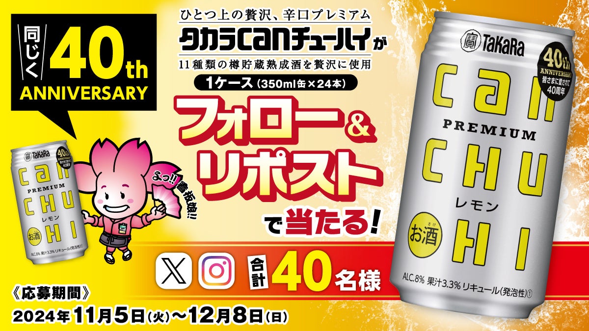 はなちゃん@チムニー宣伝部のXアカウントまたはInstagramアカウントをフォローすることでキャンペーンに参加可能。40周年の感謝の気持ちを込めて、40名様に「タカラcanチューハイ」1ケース(350ml×24本)をプレゼントいたします。