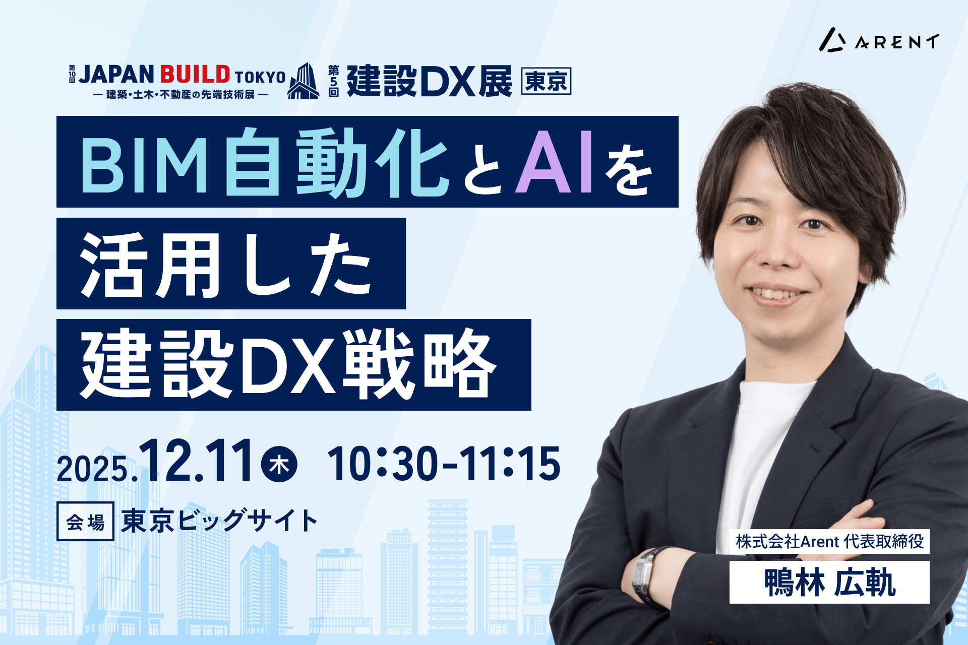また、11日(木)には代表の鴨林が「BIM自動化とAIを活用した建設DX戦略」をテーマにセミナーに登壇します。BIMの入力や活用の自動化、生成AIを用いたデータ活用・業務自動化の具体的な事例を、Arent製品を通じて紹介します。