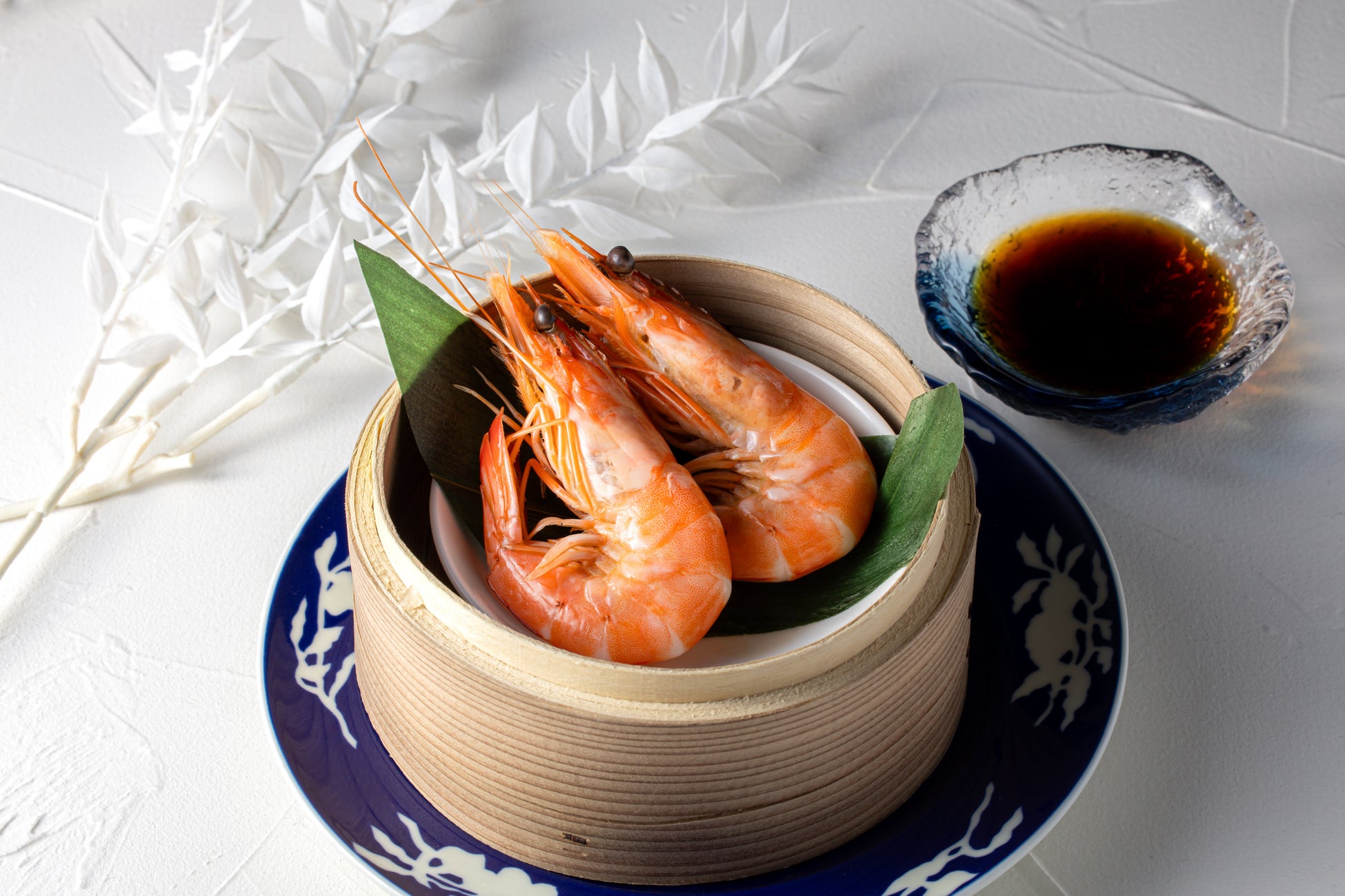一品目「天使の海老ボイル 香港スタイル」は、香港で親しまれている白灼蝦(バッチョッハー)をアレンジした一品で、ニューカレドニアのマングローブ林に囲まれた環境下で100%自然由来の餌を使用し養殖されている天使の海老を紹興酒で蒸し、引き締まった海老の身の旨味をお楽しみいただける一品です。