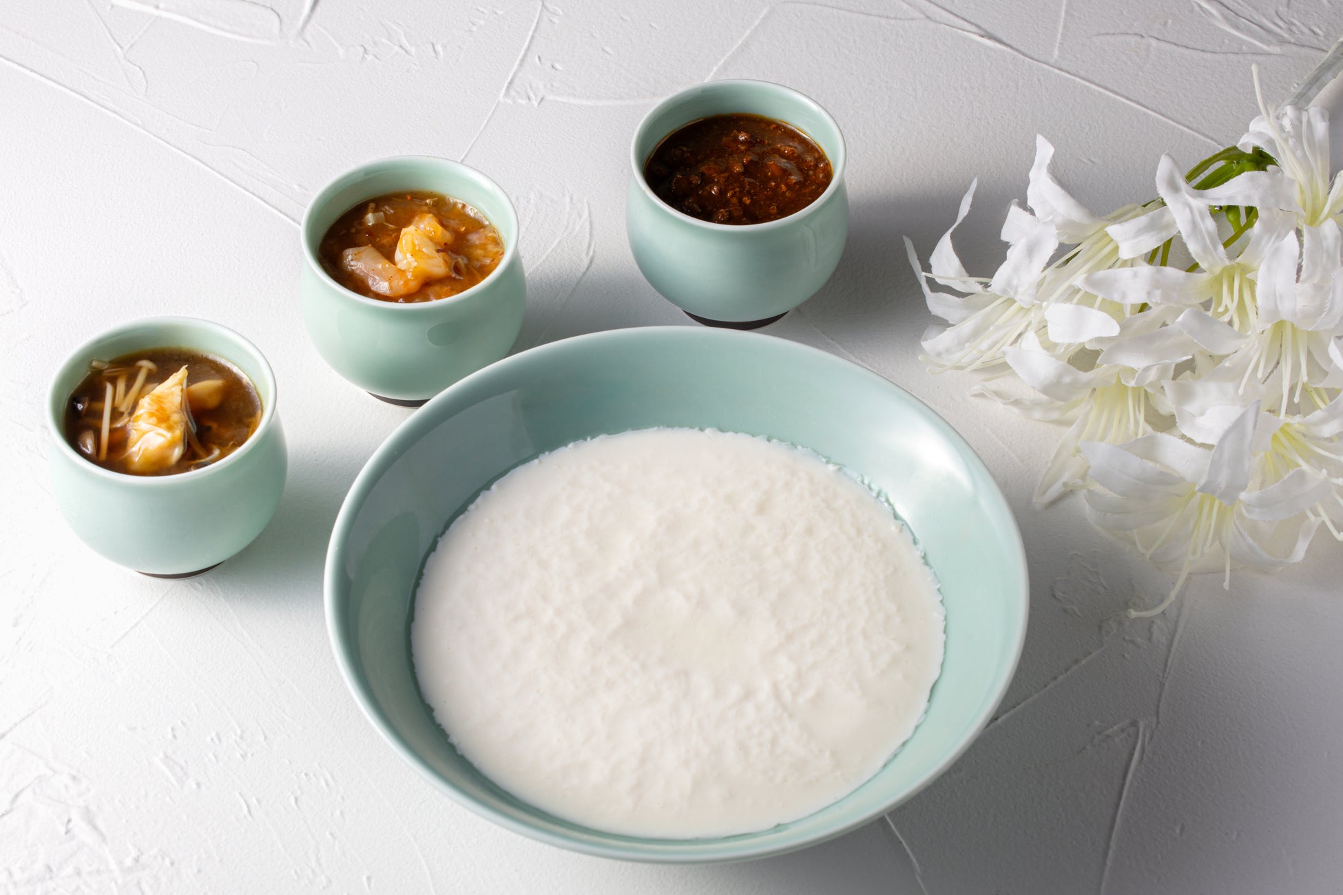 コースの終盤は、中国の伝統的な保健食品であり、身体を温める効果や内臓を養うとされ、養生の役割を果たす重要な料理の一つと伝えられている「中華粥」をご用意いたしました。ザーサイ、ピータン等のコンディメントとともにご堪能ください。
