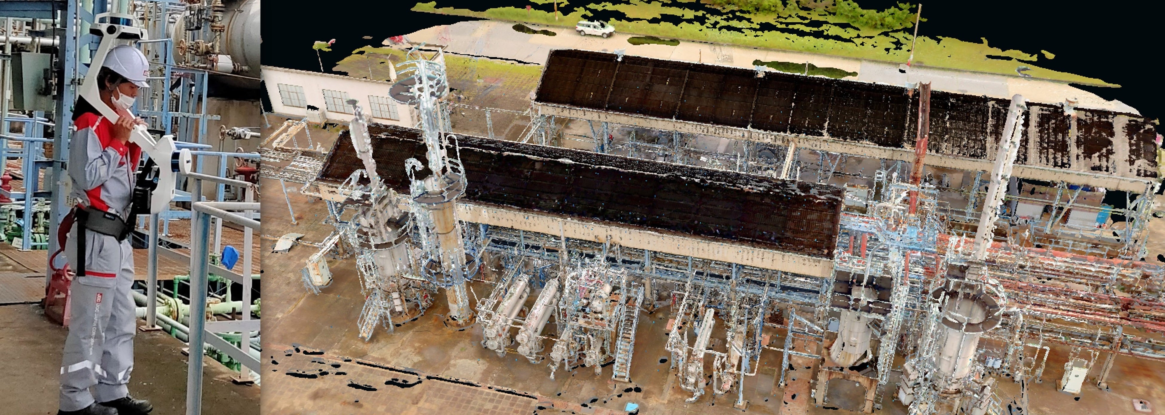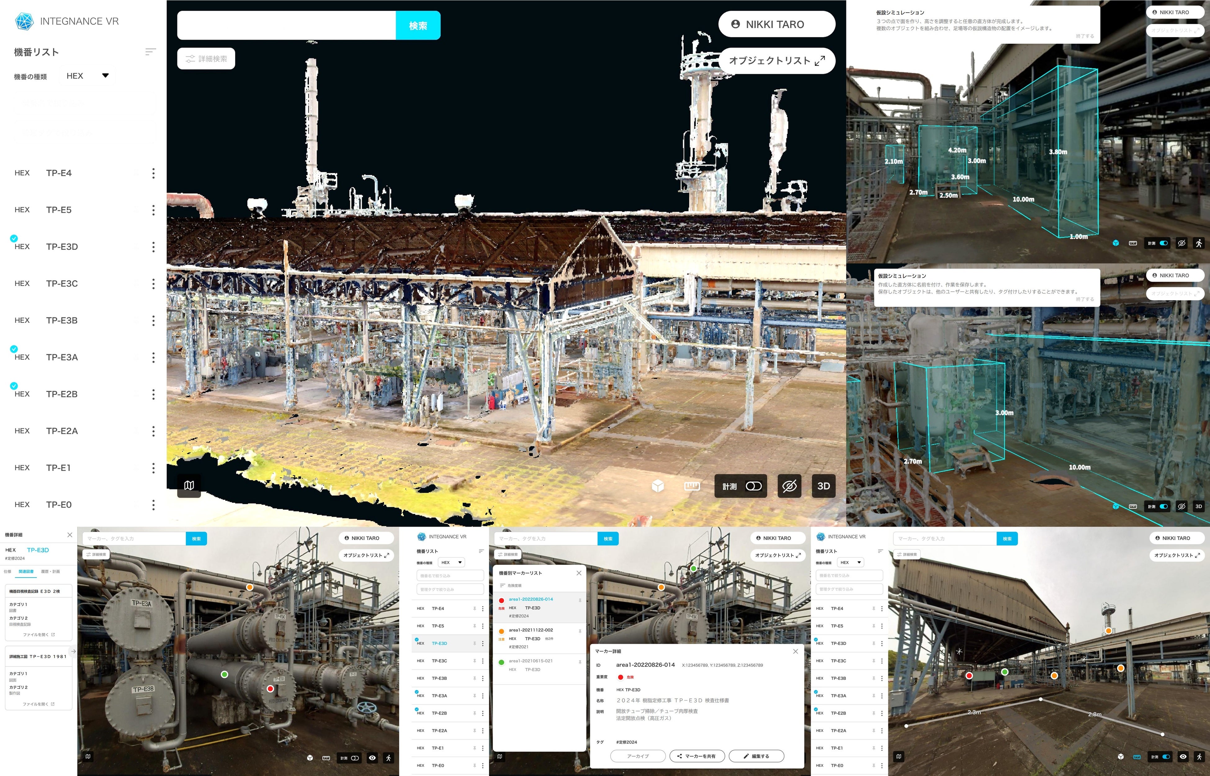 1.スマート保全業務を支援する3Dビューア「INTEGNANCE VR」スマート保全業務を支援する3Dビューア「INTEGNANCE VR」360度撮影が可能な3Dスキャンカメラで撮影した結果をウェブ上で、閲覧・管理できるクラウドサービスで、本ビューア上でアノテーション(関連データがタグ付け)された各機器や部材の相関関係を可視化し、ストリートビュー※のような操作感で視覚的かつ迅速に情報を把握することが可能となります。これにより、広大な敷地を保全する実務者の運用・保守業務の大幅な効率化を可能とします。本ビューアは石油精製・石油化学業界のみならず、幅広い産業でのサービス提供を想定しております。