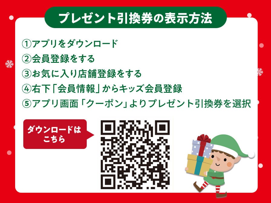 レジにてアプリ内で配信されている引換券をご提示いただくと、小学生以下のお子さまお一人様につきおひとつプレゼントいたします。