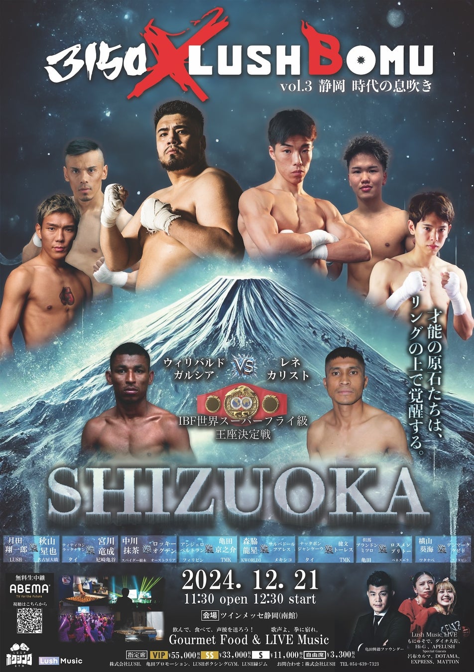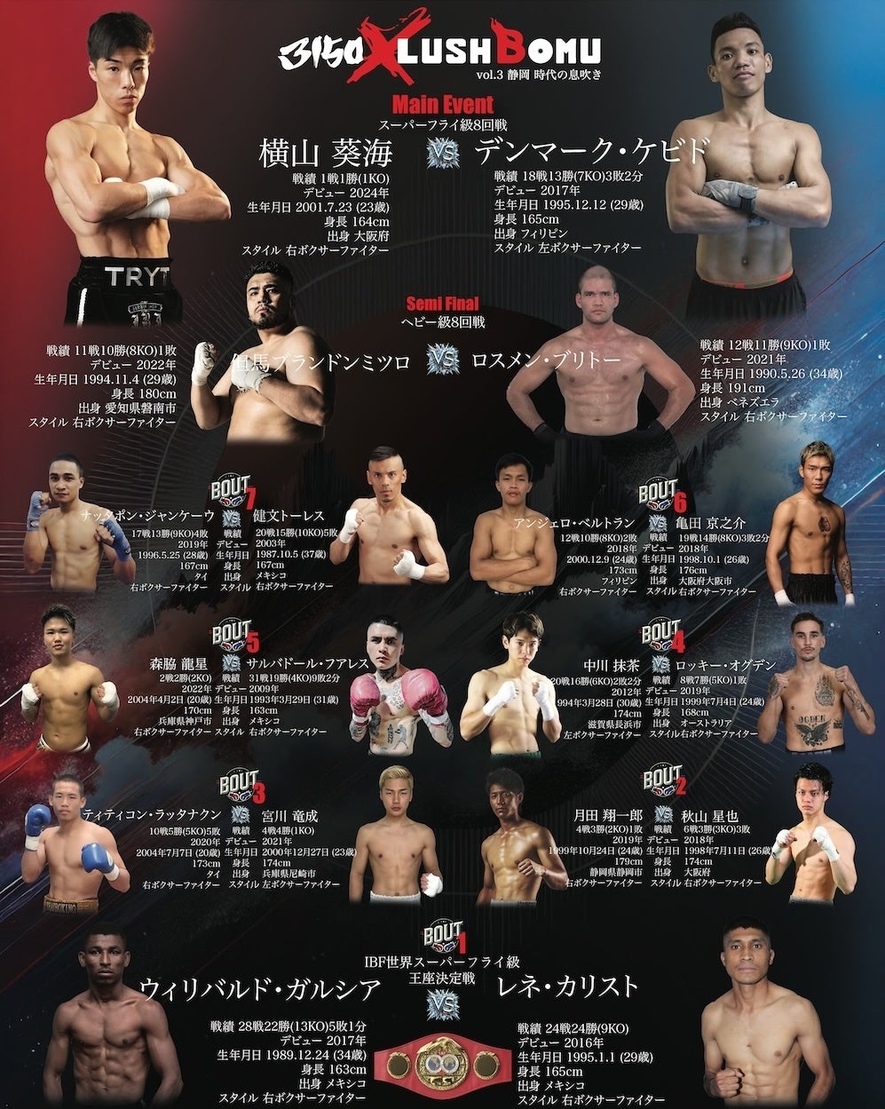 セミファイナルに但⾺ブランドンミツロ。IBF世界スーパーフライ級王座決定戦も!注目の選手目白押しで開催の「3150×LUSHBOMU vol.3」に刮目です!!