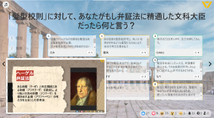 ◉種明かし!哲学者ヘーゲルの「弁証法」とは?!:最後に、議論の種明かしとして哲学者ヘーゲルの「弁証法」を説明しました。「弁証法」とは、ある『命題(テーゼ)』と、『対立関係にある命題(アンチテーゼ)』を統合し、『より高い次元の命題(ジンテーゼ)』を導き出す『止揚(アウフヘーベン)』の考え方を土台とした思考法です。これを踏まえて、弁証法で、髪型規制の校則問題の解決策を考えてみました。「髪型は自由だが、人に迷惑かからならないように注意を払う」「相手のことを思いやり自己判断してもらう」など、賛成反対ではなく、自分で判断することを重視する意見が多く出ました。規制が学校によるものではなく自己規制に置き換わることで、自由と規制が両立できています。実は髪型規制の議論内でも、一部で自然と弁証法が実践されていたのです。本音が反対派だった人が「賛成」側にまわったときに出た「普段は自由な髪型でいいが、いつでも冠婚葬祭や進学などの面接に行けるよう、日頃の準備とか学校生活をきちんとしておく」という意見は、実はアウフヘーベンされたものでした。参加者が哲学的思考に一歩踏み込んだ瞬間でした。
