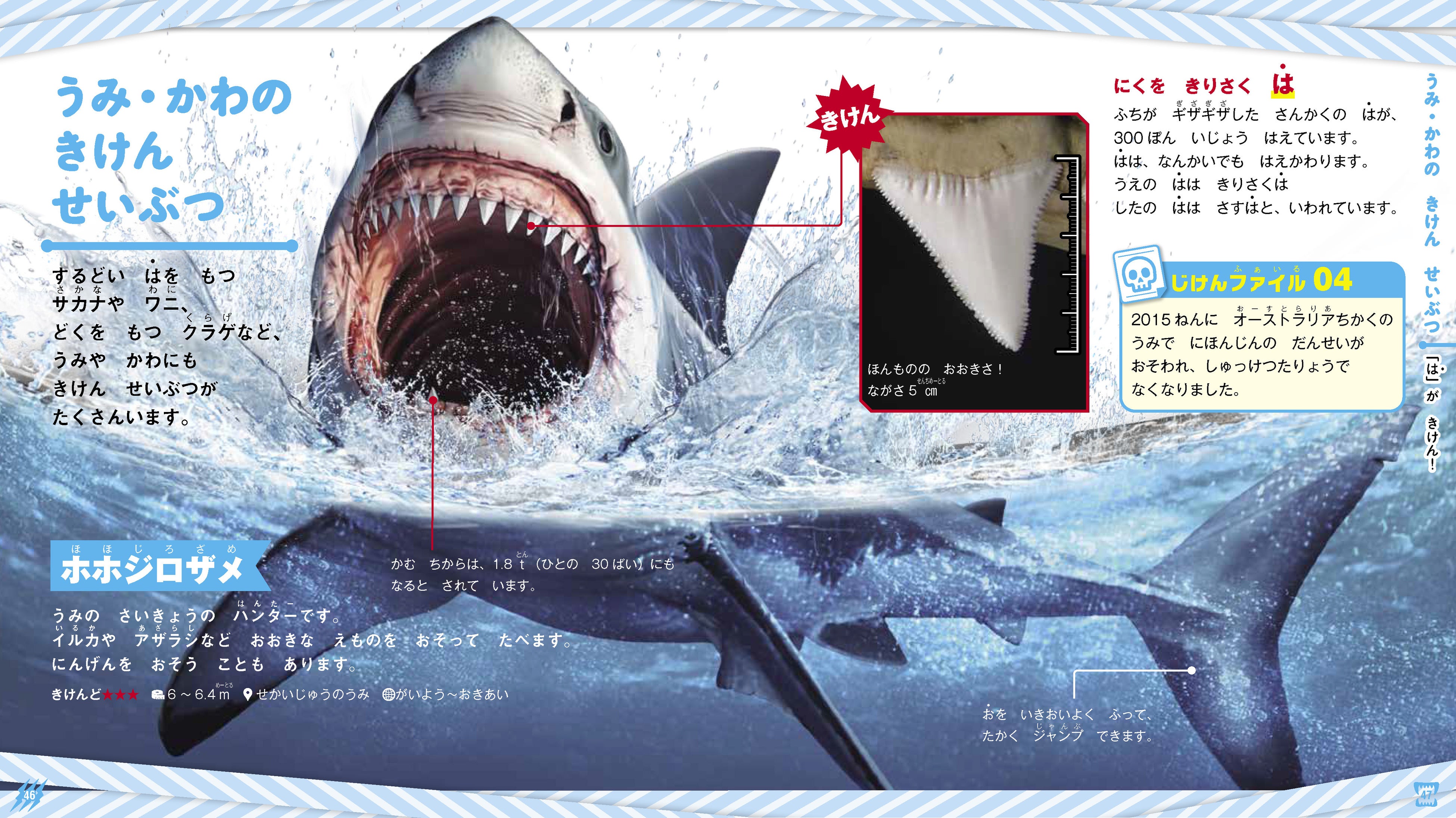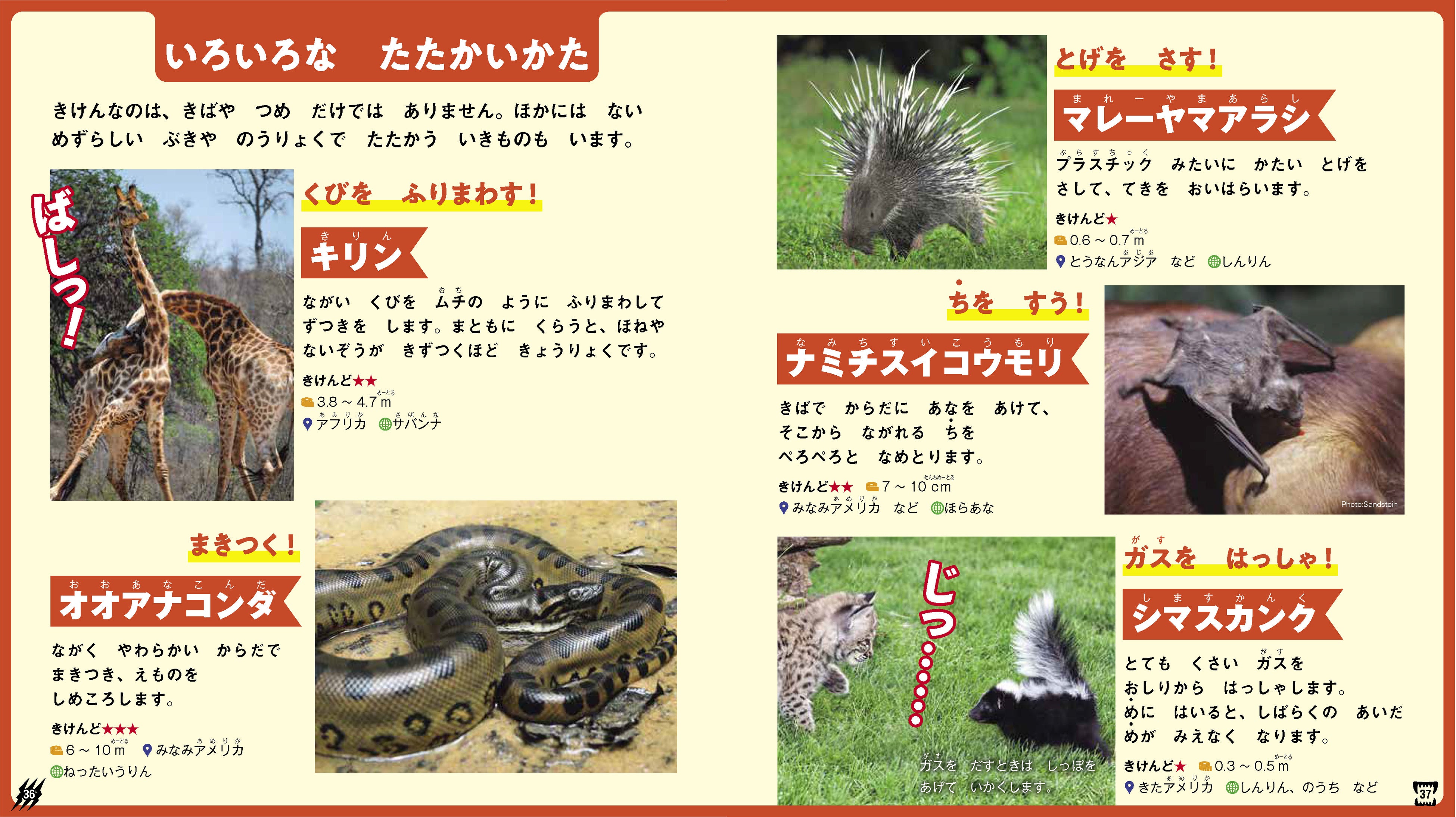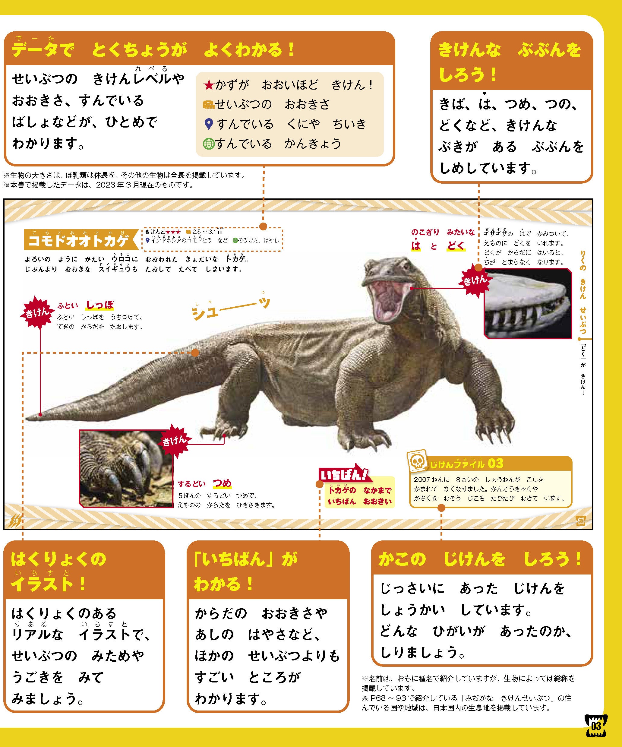 「いきものが たたかう りゆう」や「いろいろな きけんな ぶき」、「きけん せいぶつに であったら」など、写真やイラストで楽しくわかるコラムを読んで、危険生物がもっと好きになります。