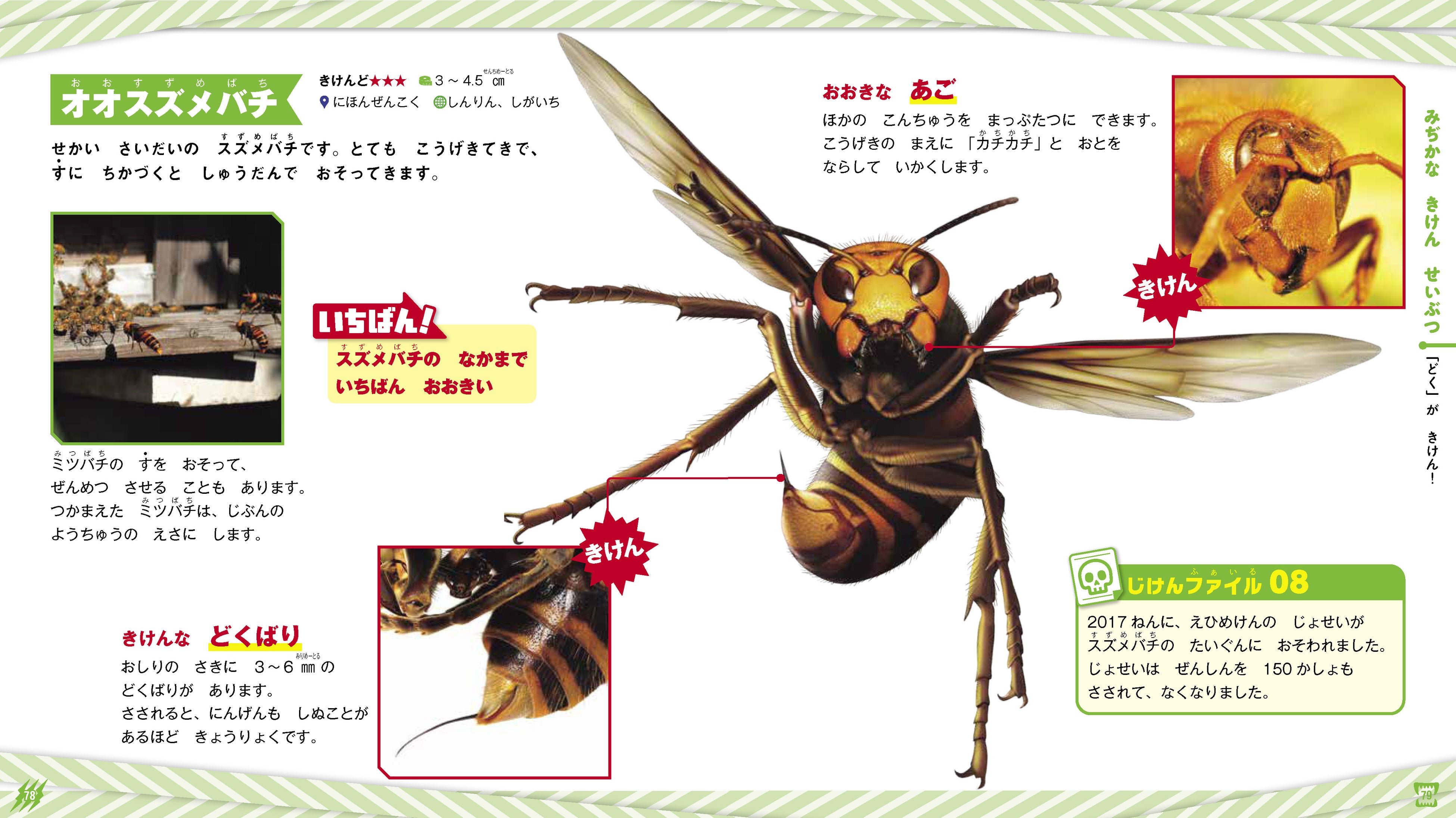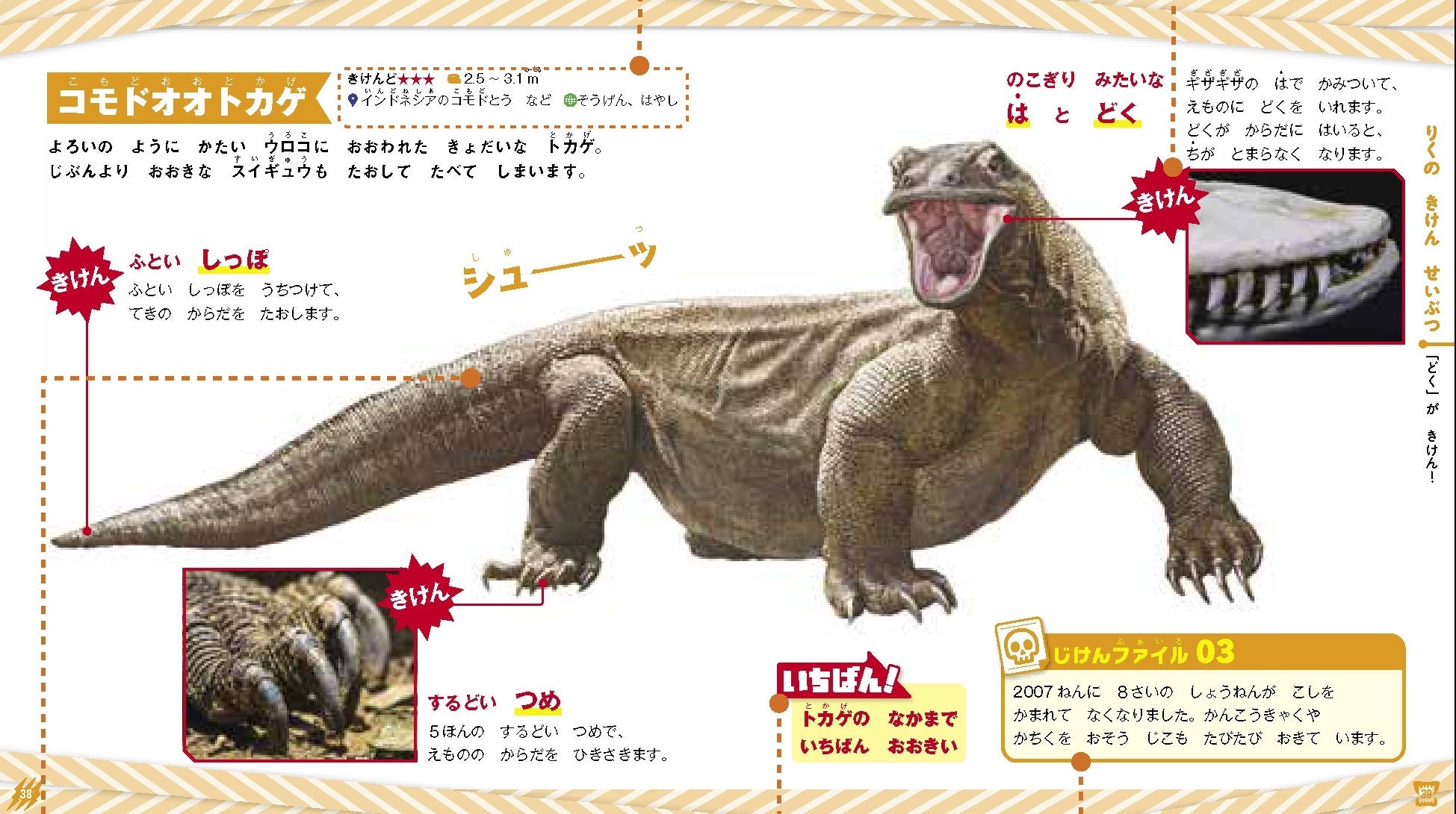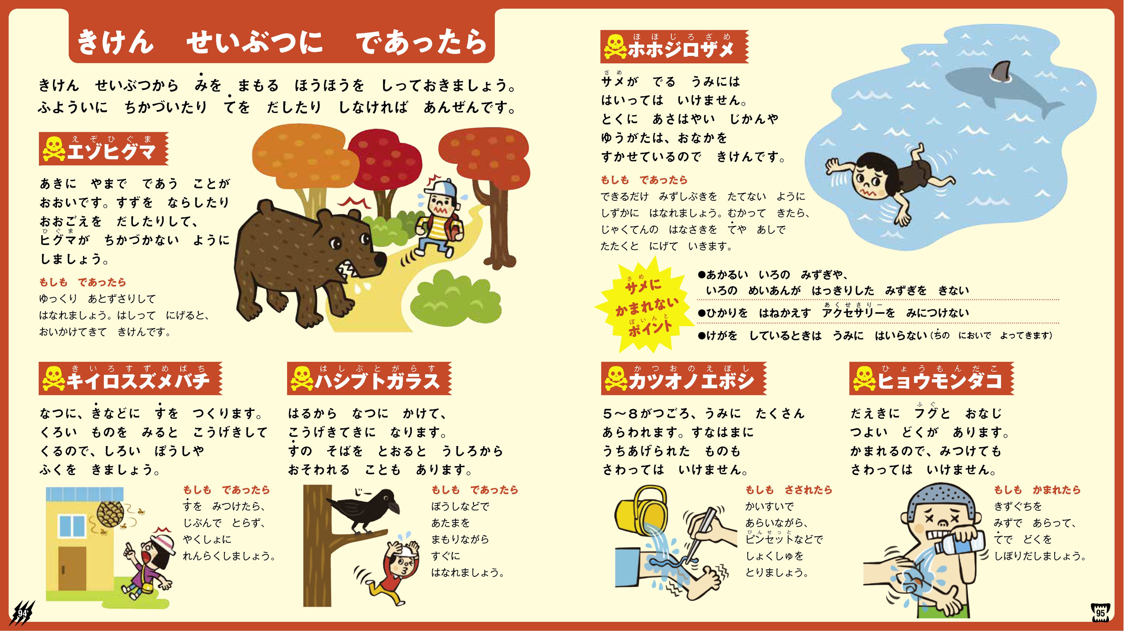 「いきものが たたかう りゆう」や「いろいろな きけんな ぶき」、「きけん せいぶつに であったら」など、写真やイラストで楽しくわかるコラムを読んで、危険生物がもっと好きになります。