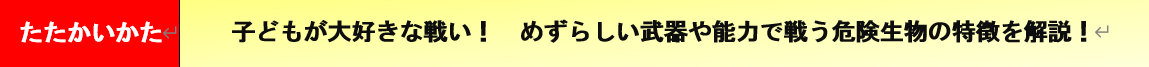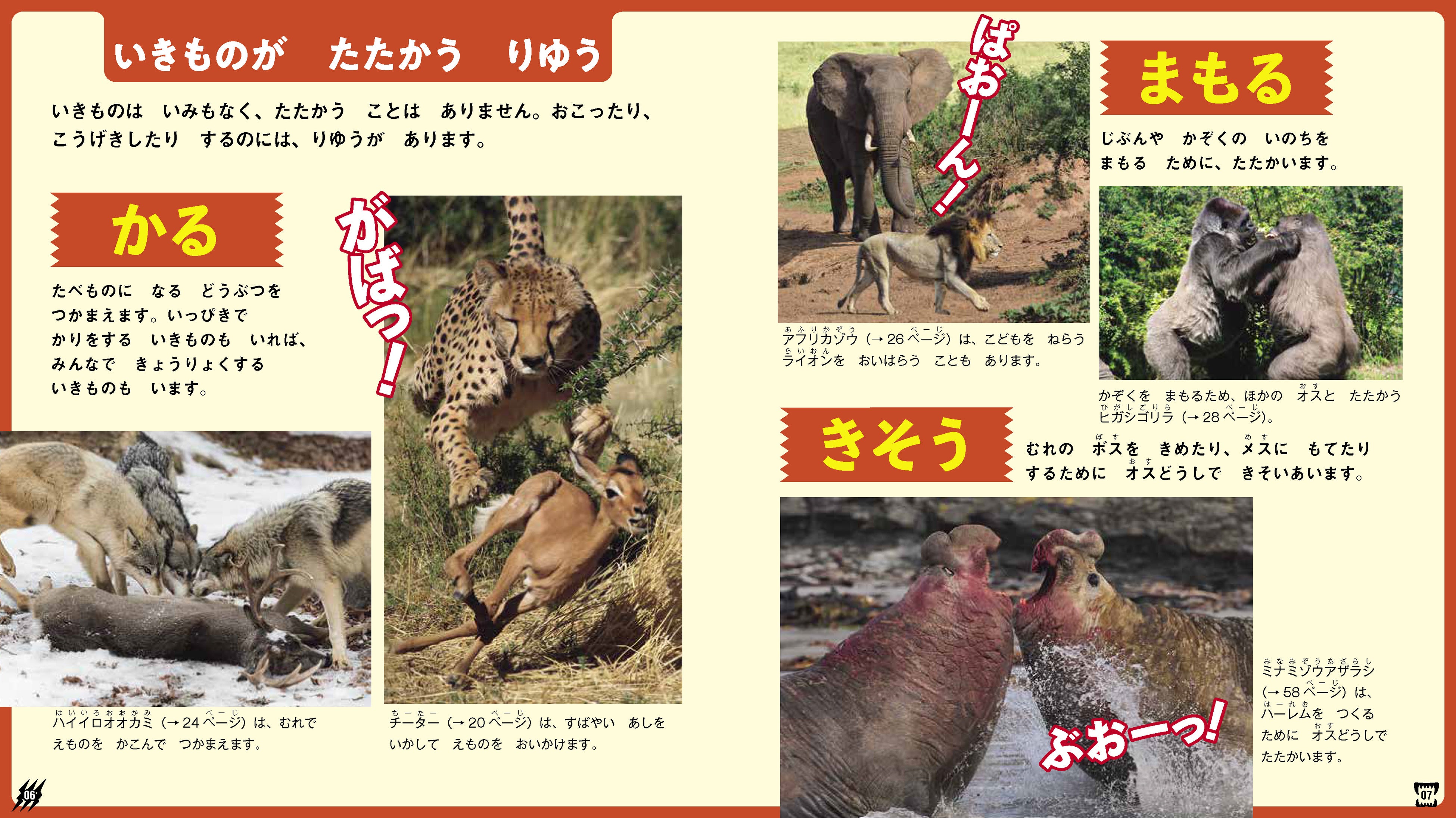 いきものが たたかう りゆう/いろいろな きけんな ぶき!/くらべてみよう! トラと ライオン/いろいろな たたかいかた/ みぢかに いる 「がいらいしゅ」/きけん せいぶつに であったら