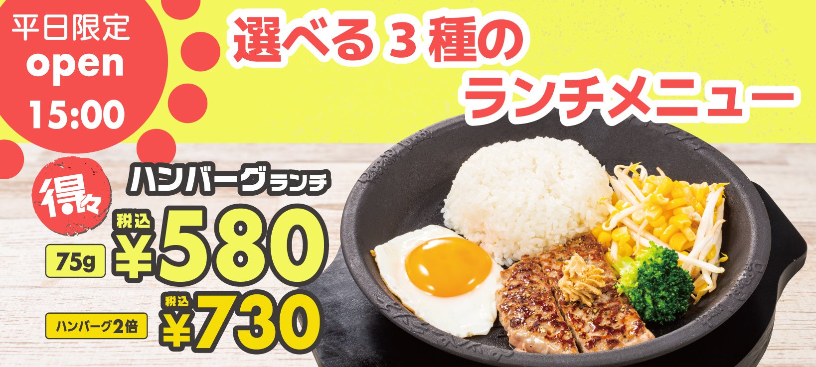 ①得々ハンバーグランチ ハンバーグ75g:580円/ハンバーグ2倍:730円