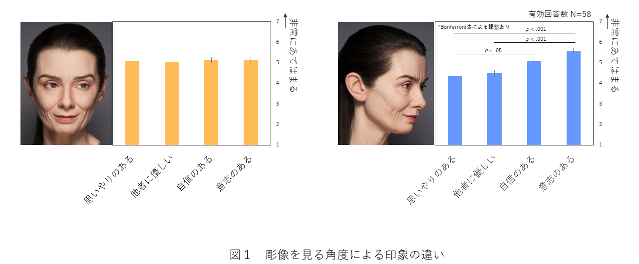 一方、複雑な表情を組み合せて豊かな内面を表現することを意図した、年を重ねた像を正面から見ると、「思いやり」「他者への優しさ」「自信のある」「意志のある」といった4つの内面印象が同じ程度に感じられていました。さらに、この印象は彫像を見る角度によって変わり、横から見た場合には、自信や意志のある印象がより強く感じられていました(図1)。