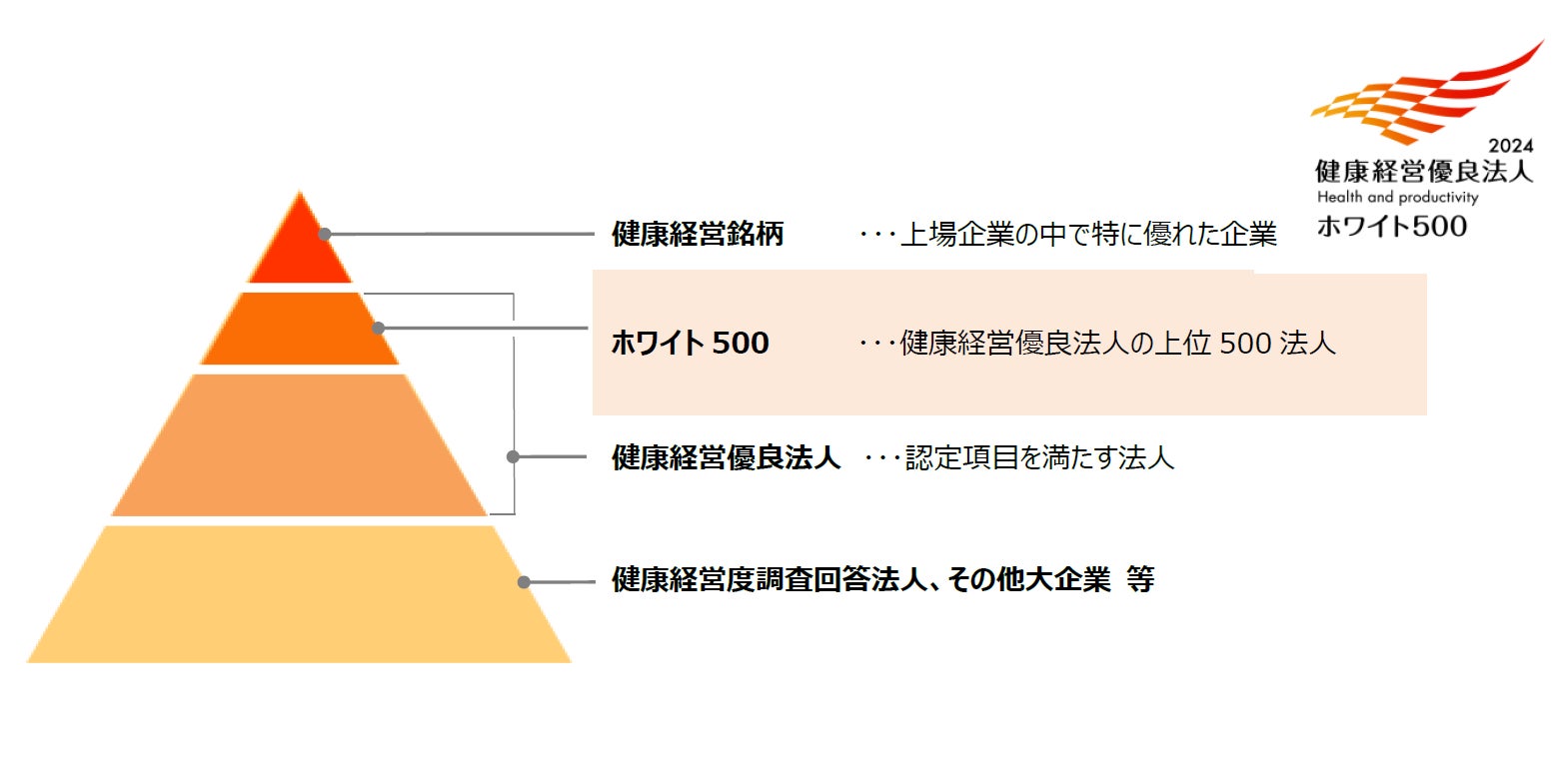 2019 年まで健康経営優良法人(大規模法人部門)全体を通称「ホワイト500」としていたが、2020 年度からは中小規模法人部門を新設し、大規模法人部門においては認定法人の中で、健康経営度調査結果の上位500法人のみを通称「ホワイト500」として認定。