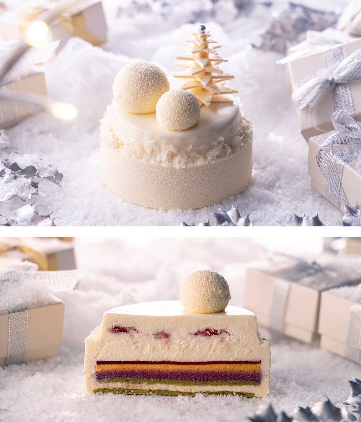 雪が積もった美しい景色をイメージし、オールホワイトで揃えたクリスマスケーキ。ワントーンながら異なるテクスチャーで構成され、見た目も食感も楽しい仕上がりに。ケーキをカットすると、7層からなる鮮やかな色味にふと笑みがこぼれるはず。くちどけのよいムースをベースにした、軽やかで優しい味わいのショートケーキです。