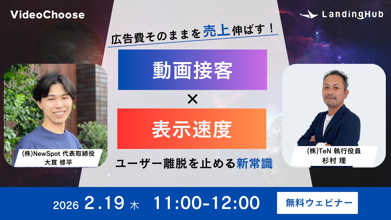 株式会社TeN(本社:東京都渋谷区、代表取締役:廣瀬 由典)が提供する表示速度改善ツール「LandingHub(ランディングハブ)」は、NewSpot株式会社(本社:東京都渋谷区、代表取締役:大貫 修平)が提供する動画接客ツール「VideoChoose」と共同で、オンラインセミナーを2026年2月19日(木)に開催します。