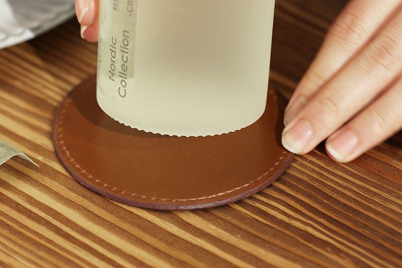 シンプルでビターな色味のレザー調のコースターが付属。