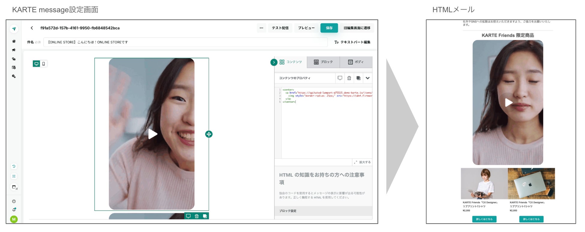 KARTEシリーズのプロダクトには、マルチチャネルマーケティングオートメーションの「KARTE Message」があります。Fireworkで設定した動画のGIFサムネイルをメールのコンテンツとしてKARTE Message上で設定することが可能です。