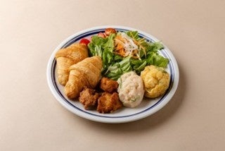 クロワッサン・2種のポテサラ・から揚げ・サラダと植物生まれの素材で作ったワンプレートランチ 990円(税込)