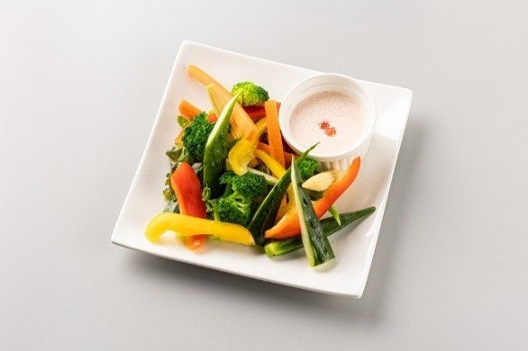 新鮮な野菜を、自家製マヨネーズと植物生まれの明太風ペーストで仕上げた、動物性原材料不使用のディップとともにご提供します。