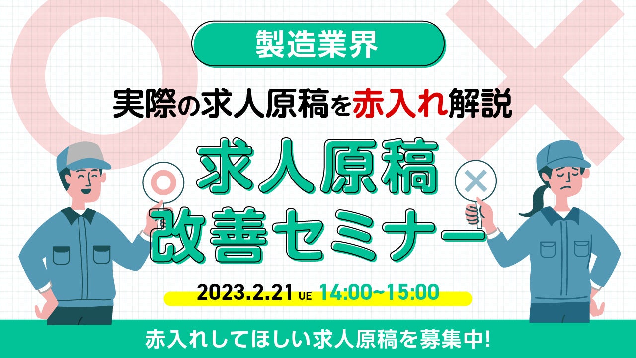 企業のオウンドメディアリクルーティングを支援する株式会社天職市場(本社:東京都新宿区西新宿、代表取締役:春名 敬太)は、2023年2月21日(火)に社員採用担当者向けオンラインセミナー『実際の求人原稿を赤入れ解説【製造業界】求人原稿改善セミナー』を開催いたします。