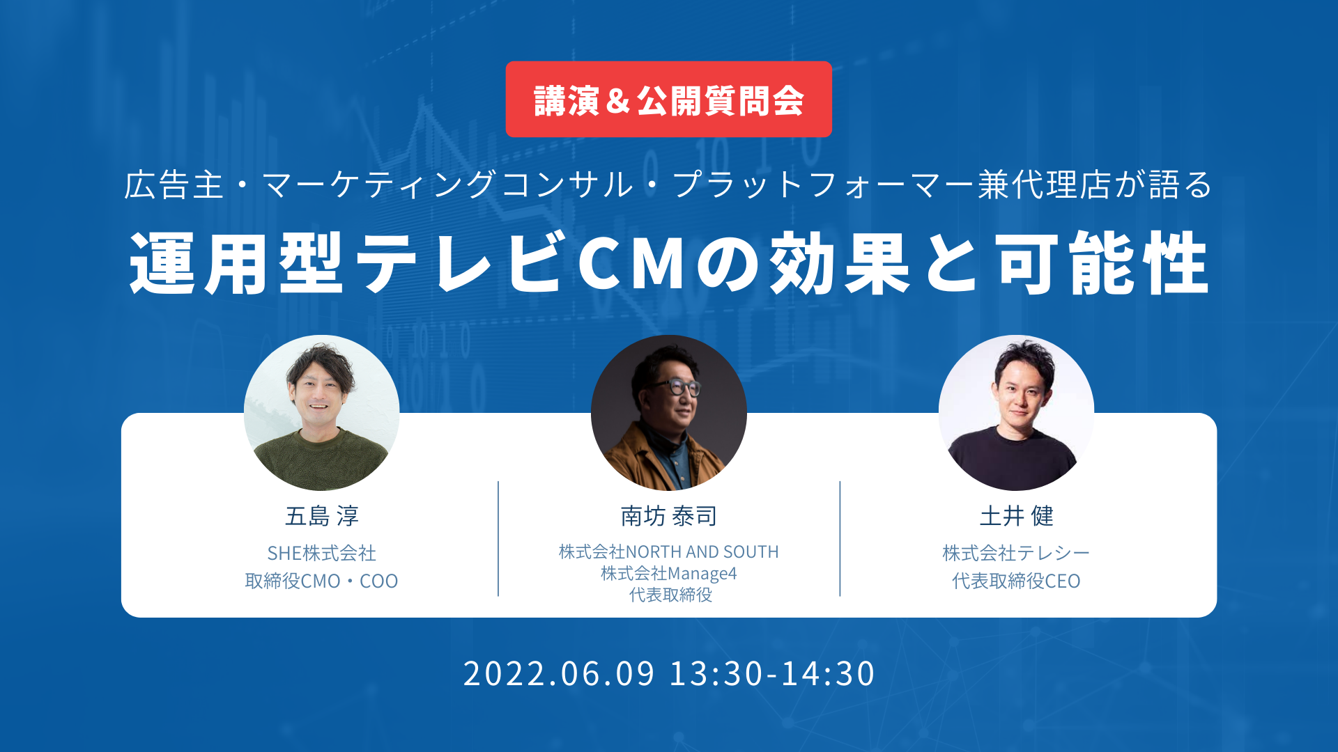 本ウェビナーでは、SHE株式会社の取締役CMO・COO五島 淳氏、株式会社NORTH AND SOUTH/株式会社Manage4代表取締役の南坊 泰司氏をゲストとしてお招きし、テレシー代表取締役CEOである土井 健と、SHEのテレビCM実施に至った経緯や、実際の効果についてお話しいたします。