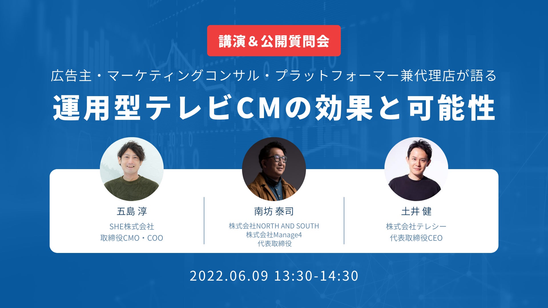 SHE株式会社の取締役CMO・COO五島淳氏、株式会社NORTH AND SOUTH/株式会社Manage4 代表取締役南坊泰司氏をゲストとしてお招きし、SHEのテレビCM実施に至った経緯や、実際の効果についてお話しいただきます。