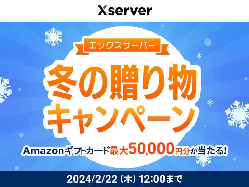 エックスサーバー株式会社(所在地:大阪市北区、代表取締役:小林 尚希)は、2024年1月26日(金)から2024年2月22日(木)まで、同社が提供するサービスの契約者を対象として、Amazonギフトカード最大50,000円分が抽選で155名様に当たる「エックスサーバー 冬の贈り物キャンペーン」を開催いたします。