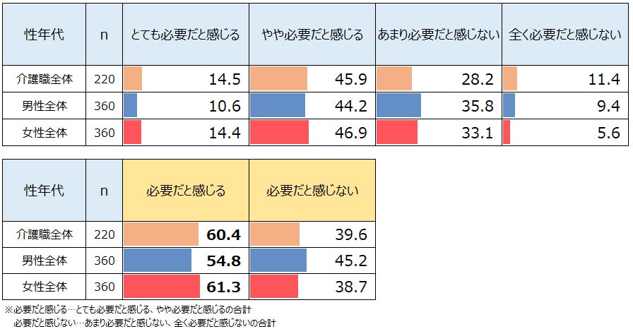 今回実施した「介護脱毛に関する調査」によると、自身が将来介護されるときのためにVIO脱毛が「必要だと感じる」と回答した割合は介護職・一般男女ともに半数以上であり、2人に1人が将来的にVIO脱毛の必要性を感じていることが分かりました。
