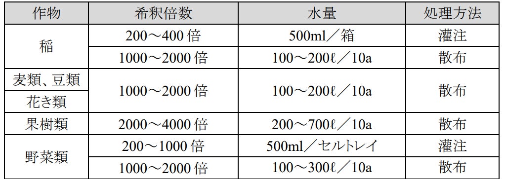 散布で使用する場合は、10aあたり本製品使用量が100~200mlとなるよう希釈液を調製し使用すること