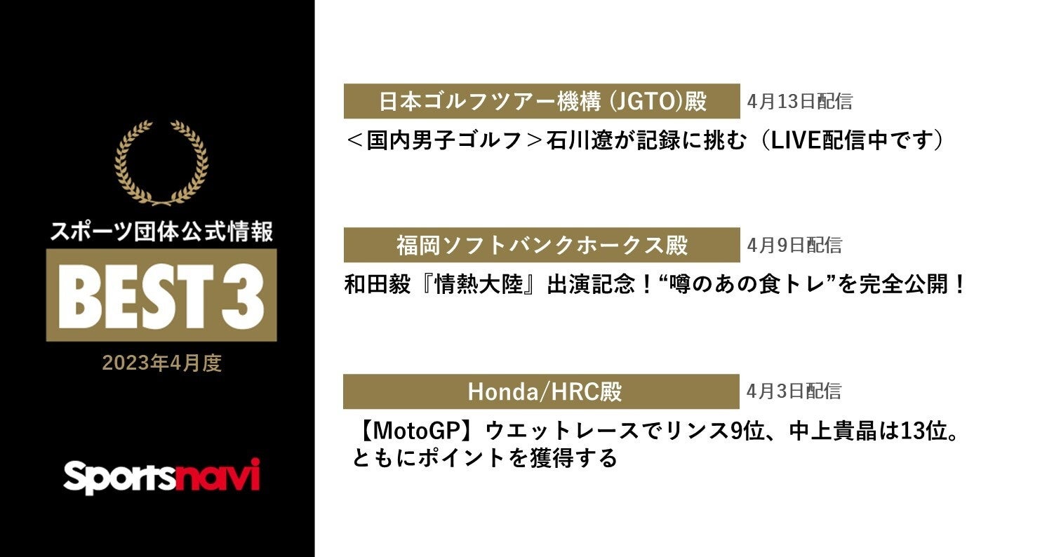 日本ゴルフツアー機構 (JGTO)、福岡ソフトバンクホークス、Honda/HRCが受賞! スポーツ団体公式情報月間ベスト3(2023年4月度)
