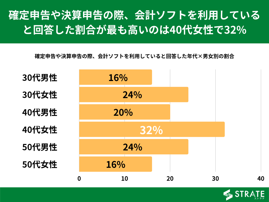 確定申告や決算申告の際、会計ソフトを利用していると回答した割合を年代×男女別でみてみますと、40代女性が最も多く32%、次いで30代女性と50代男性の24%、30代男性と50代女性は16%にとどまりました。