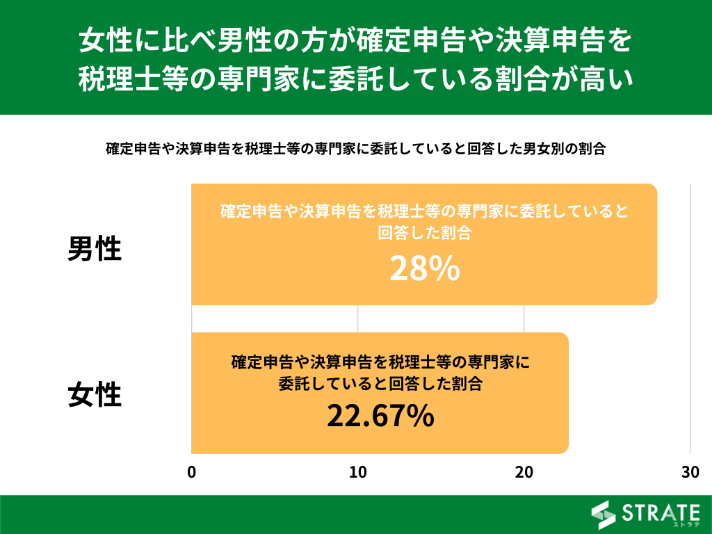 確定申告や決算申告を税理士等の専門家に委託している割合を男女別でみてみますと、男性は28%、女性は22.67%という結果になりました。