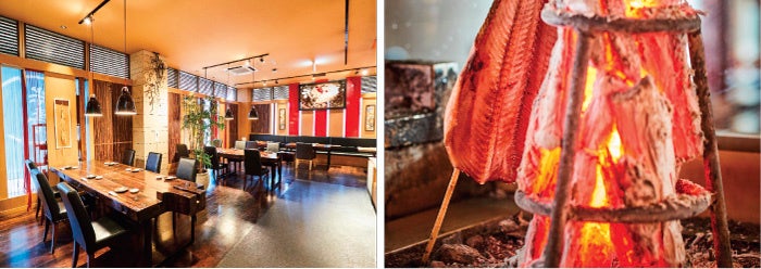 焼き魚の調理のコツは「強火の遠火」と言われ火力の強い炭火が理想です。「原始焼き」は、炭火と焼き物との距離で火加減を調節する昔の生活の知恵であり。最も原始的な焼き方であることがその名の由来になっています。炭の回りを囲んで「輻射熱」を利用して焼くため、きれいな焼き色が付くだけでなく、魚の脂が炭に落ちずに煙がたたないため、魚が燻されずに新鮮そのままの凝縮した旨みを味わうことができます。さらに2種類の炭を使うことで、表面はパリっと香ばしく、中はふっくらと仕上がります。