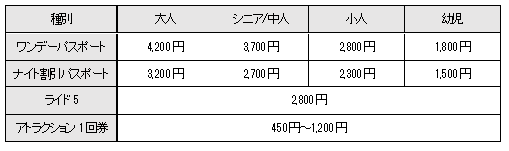 | ワンデーパスポート | 4,200円 | 3,700円 | 2,800円 | 1,800円 |
