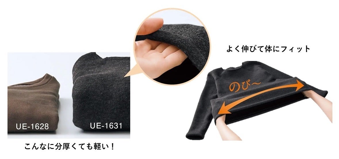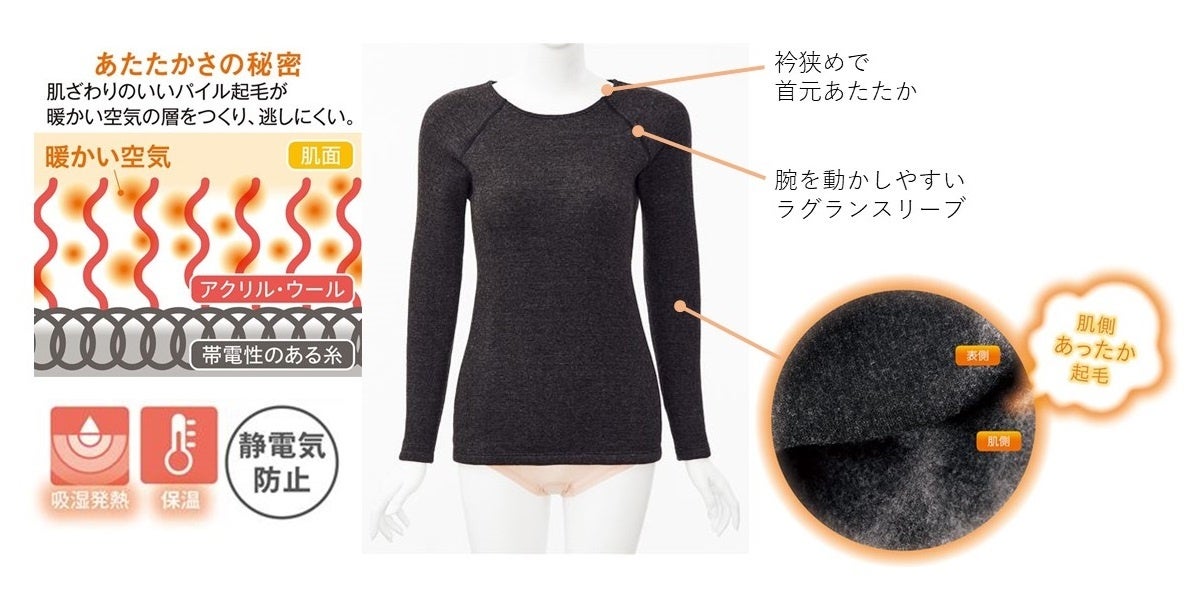 あたたかさの秘密は、ウールをブレンドした生地。しっかり暖かい厚手の生地と、肌側は起毛をかけた吸湿発熱素材でやさしい肌触りに。暖かい空気の層ができるので、熱を逃しにくく保温効果も。また、静電気防止機能も備えているので、冬場のイヤなパチパチを軽減。寒い冬には欠かせない商品です!暖かなインナーをお探しの方は、ぜひこの商品をお試しください!