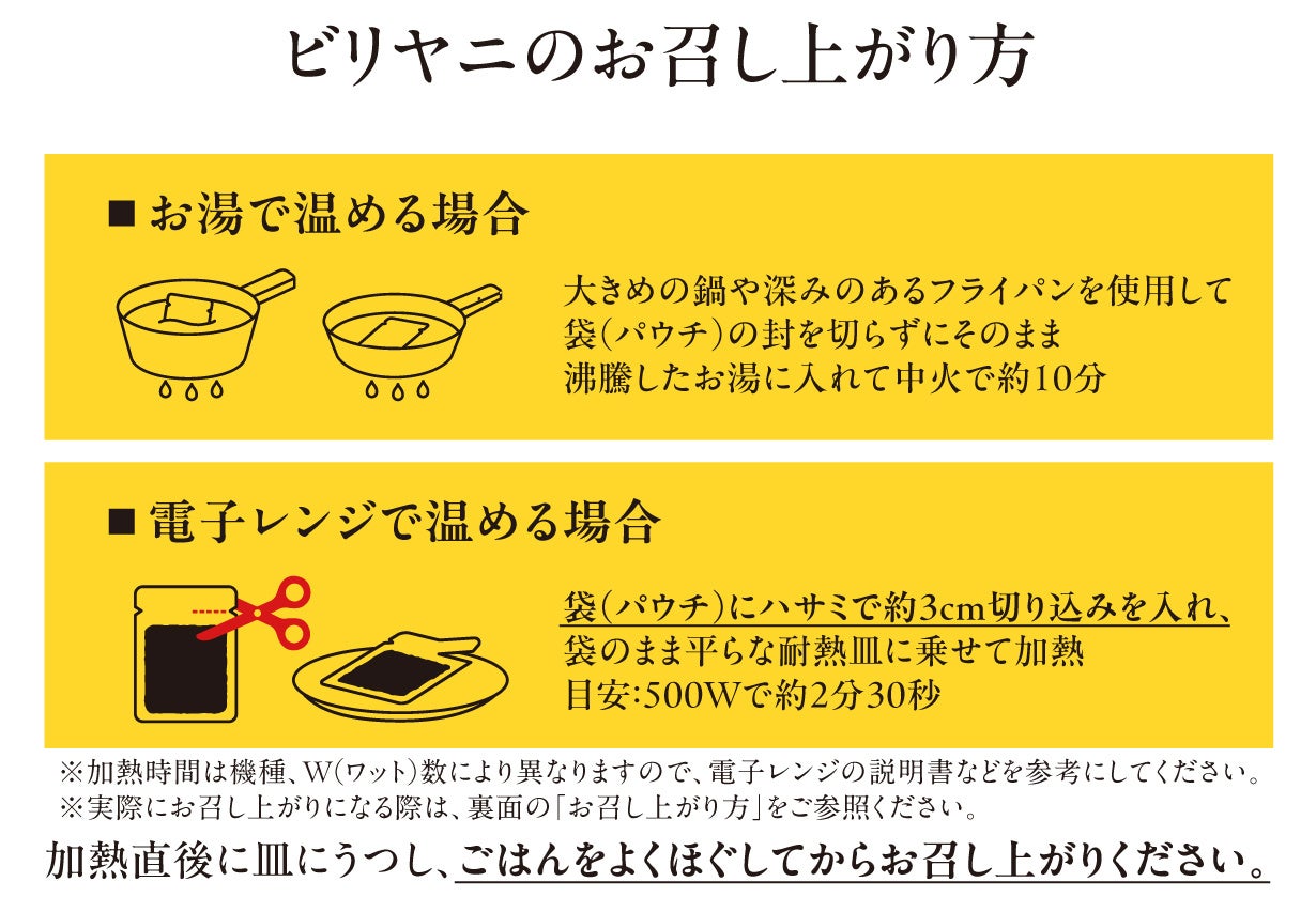 炊き上がったごはんが入っているため、温めるだけで手軽にビリヤニをお召し上がりいただけます。