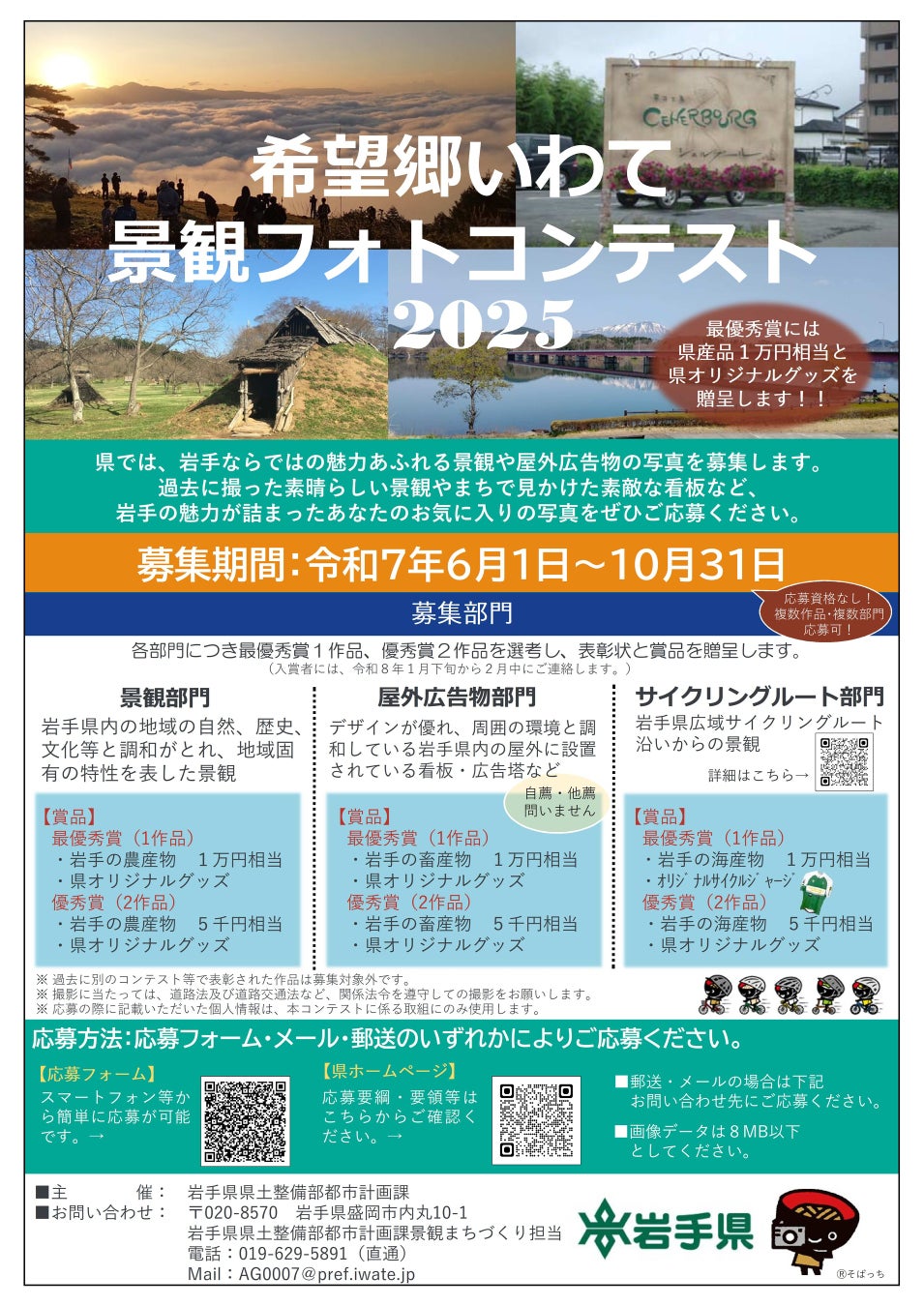 岩手県は、県ならではの魅力あふれる景観や屋外広告物の写真を募集し、優れた作品の応募者には県産品と県オリジナルグッズを贈呈します。