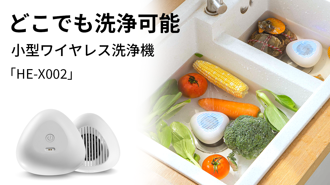 「HE-X002」はヒドロキシ水浄化技術を使用したワイヤレス小型洗浄機です。ボタンを押すだけで簡単に野菜や果物に付着した細菌や農薬を除去できます。